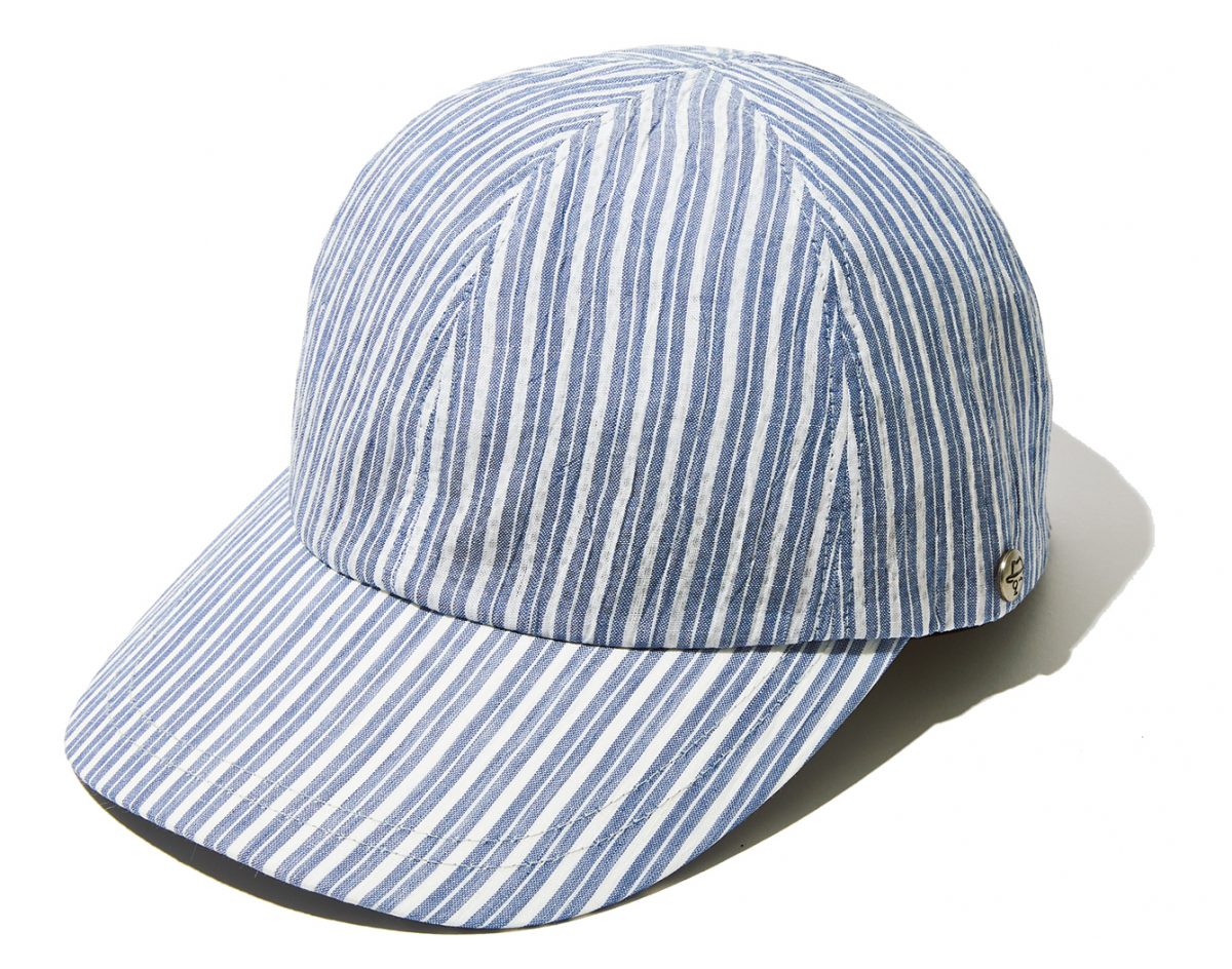爽やかなストライプのブランドバッジ付きキャップ。カッティングで山型を微妙に大きく整えているため、顔とのバランスが良く見える。