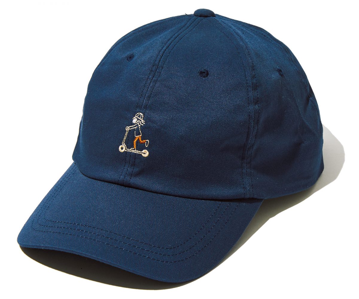 キックボーダーをモチーフにした刺繍デザイン。ウォッシャブル仕様で、汗や汚れを気にせずラフに被れる。生地は程よく光沢のあるコットンチノ素材。