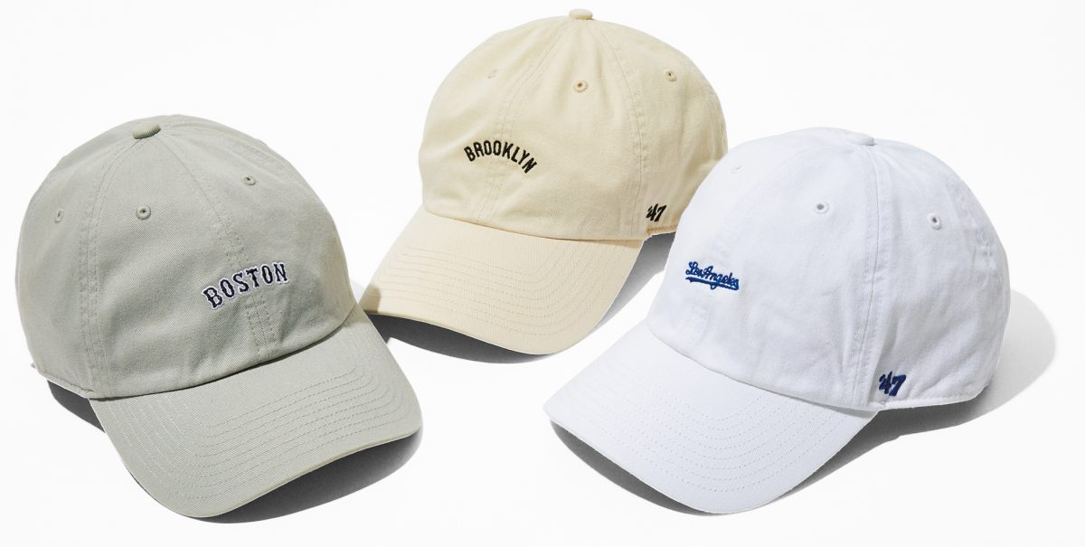 「’47」は1947年にアメリカ・ボストンにて誕生したキャップブランド。現在ではMLBをはじめとするアメリカ4大プロスポーツとパートナー契約を結んでいる。左からボストン・レッドソックス、ブルックリン・ドジャース、同球団が移転した現在のロサンゼルス・ドジャースの本拠地をミニロゴでデザインした新作キャップ。浅めのクラウンで、シルエットも今風となっている。