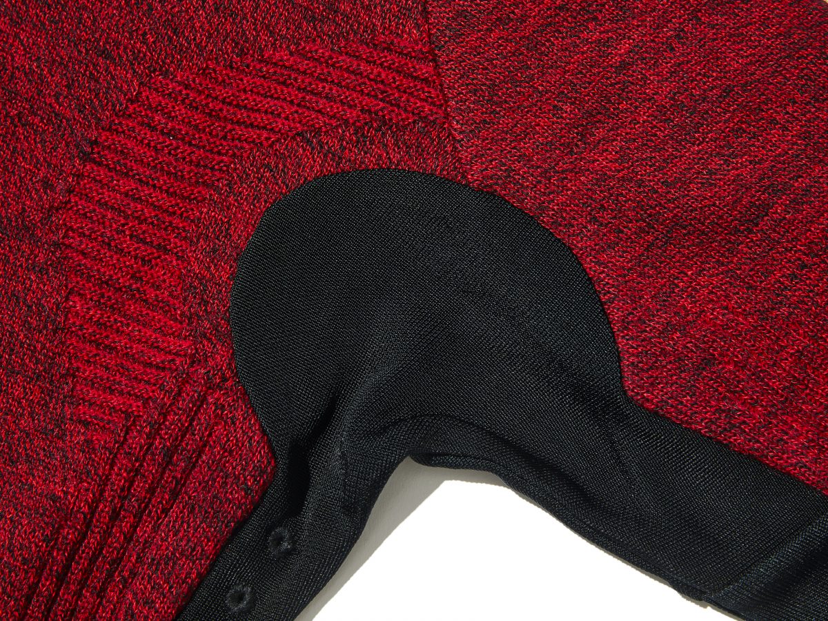 オーガニックウールを使用しつつ、脇や袖下などゴルフの動きの中で摩耗強度が求められる部位には、毛玉ができにくく吸放湿性のある繊維「ベンベルグ」を使用。素材の異なる箇所はカラーリングを変えており、デザイン面で良いアクセントになっている。