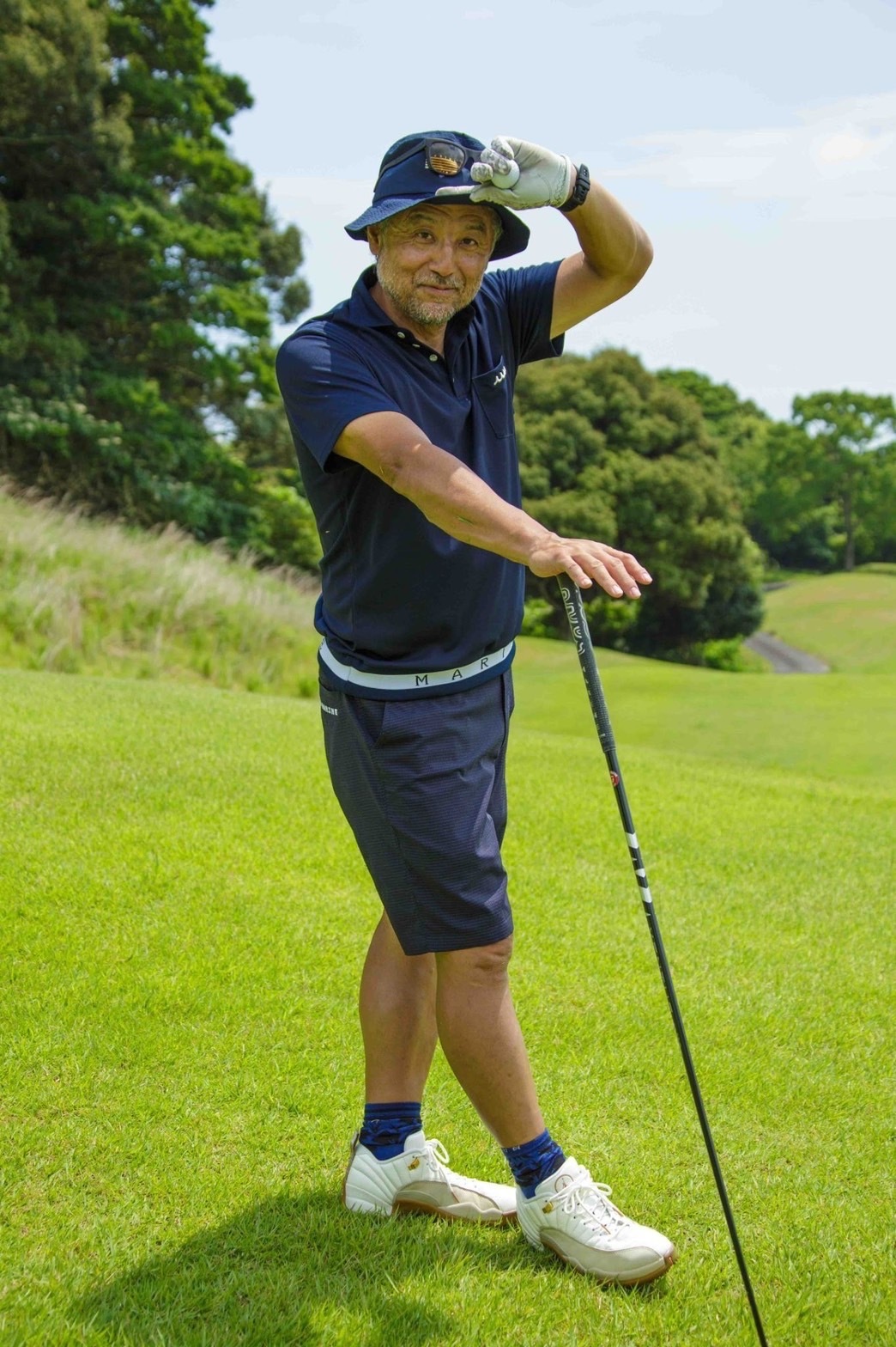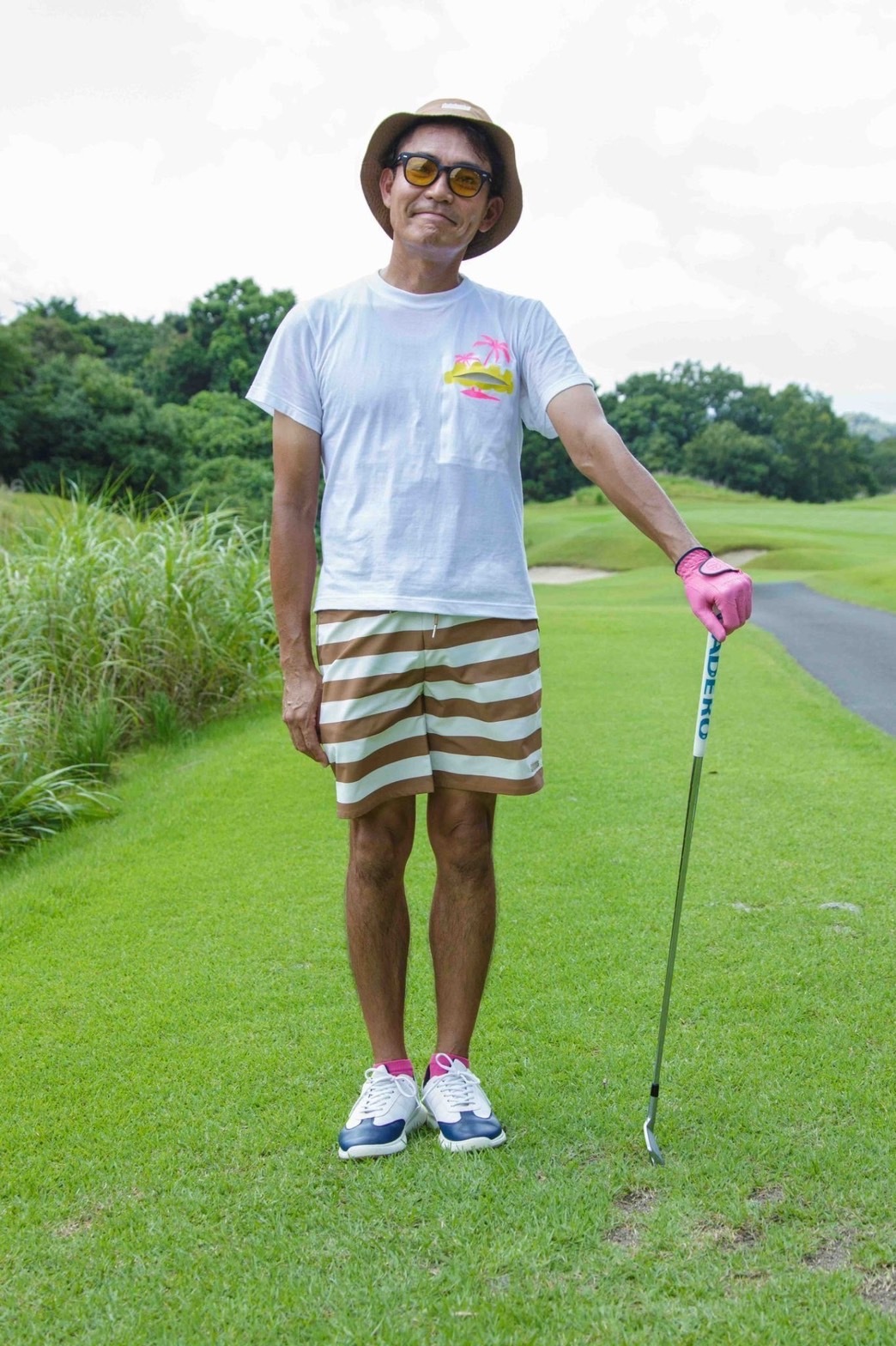 ターフで存在感を醸す赤のフルレングス。プリントポロと合わせたのは正解。