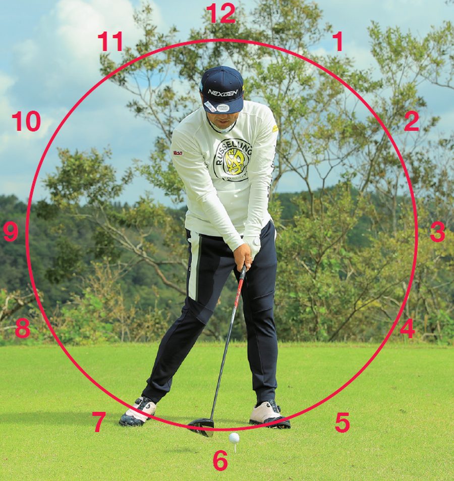 円軌道の最下点をイメージして、そこに頭の位置をセットする。なんとなく決めるとミスにつながる。