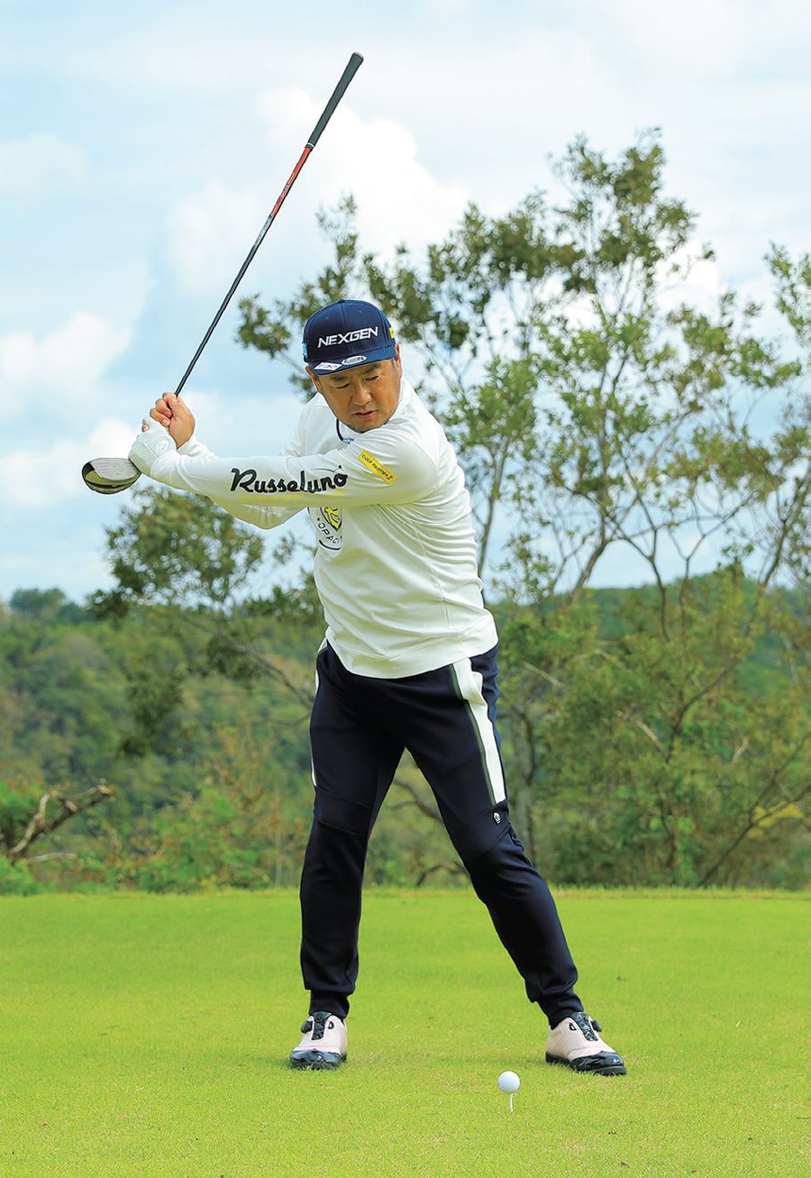 クラブを上から下に振り抜きたいなら、まず下に振り抜くための体勢を考える。そうすればクラブを上げるべき位置は必然的に決まってくる。