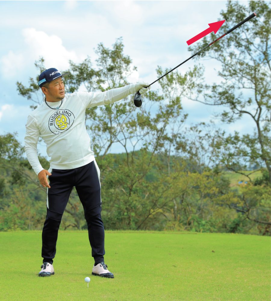 フォローでクラブを高く振り抜きたいならアドレスは右足体重になり軸は右に傾くはず。この体勢であとは振り抜くだけ。