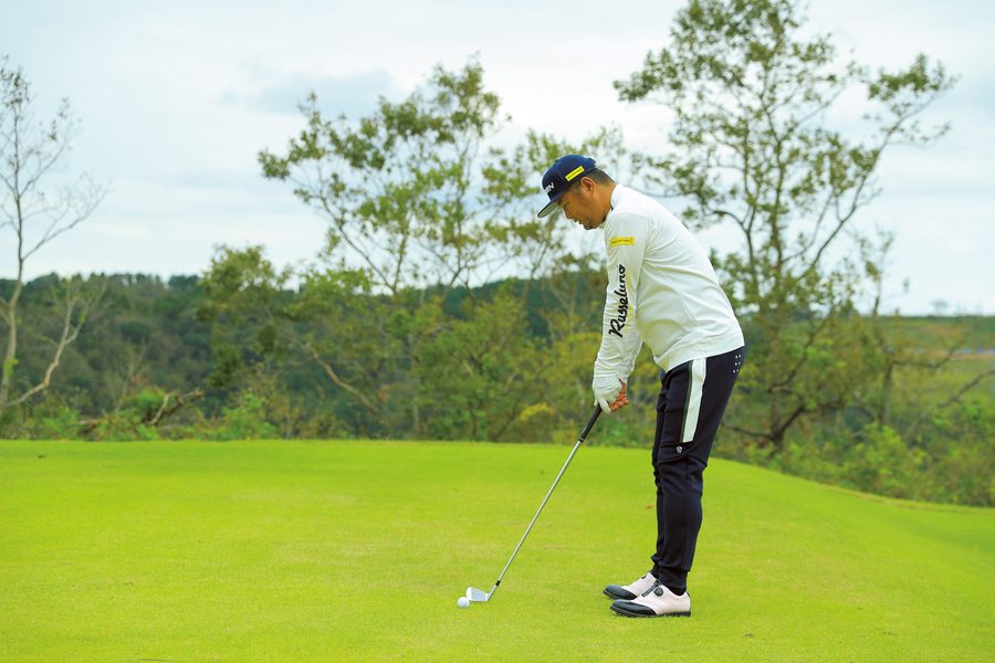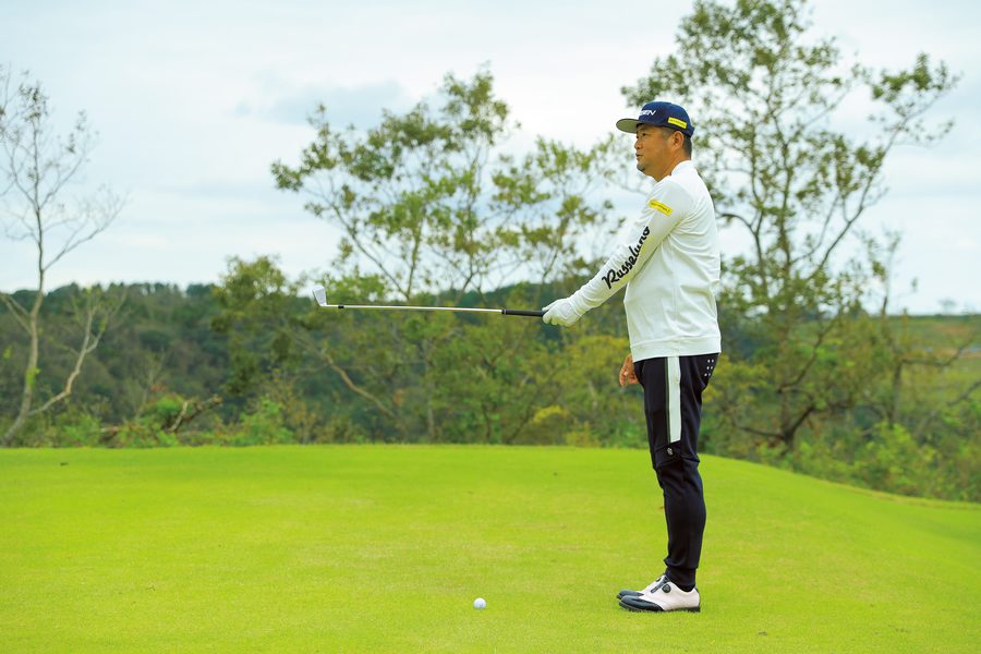 体とボールとの距離がしっくりこないという人は多いが、この問題も簡単に解決できるとのこと。「ポイントは左腕です。よく左ワキを締めると表現しますが、正しくは“締まる”ものです。左ヒジを地面に向けるようにして、腕が胸の上にのるポジションが適正位置です。ヒジを外側に向けていると胸に腕が引っかからないはずです。左腕が胸に引っかかる位置がわかれば、あとは前傾すればボールとの距離が決まります」。