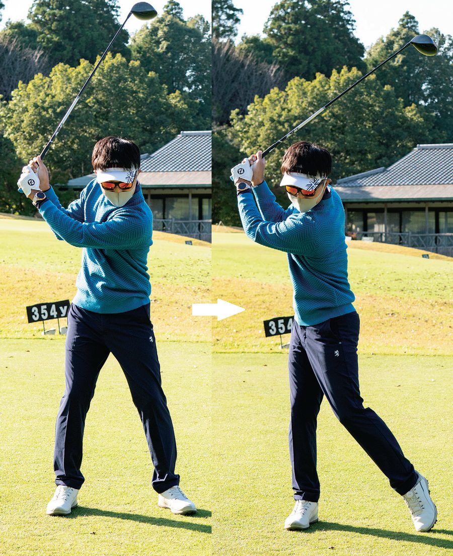 左足のカカトを上げて、同時に左ヒザを内側に寄せていくようにすると体が回りやすくなり、体が硬い人でも十分なバックスイングができる。