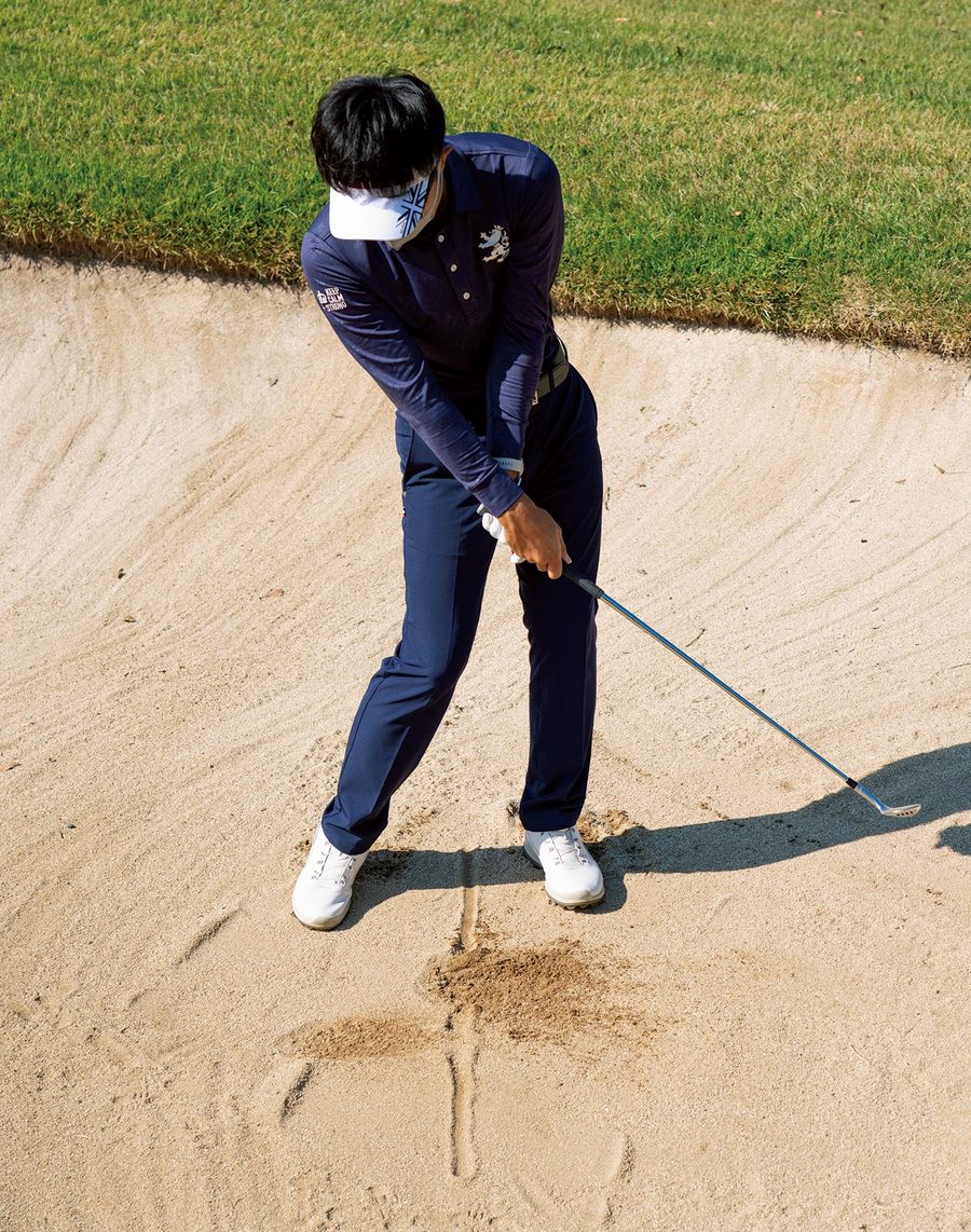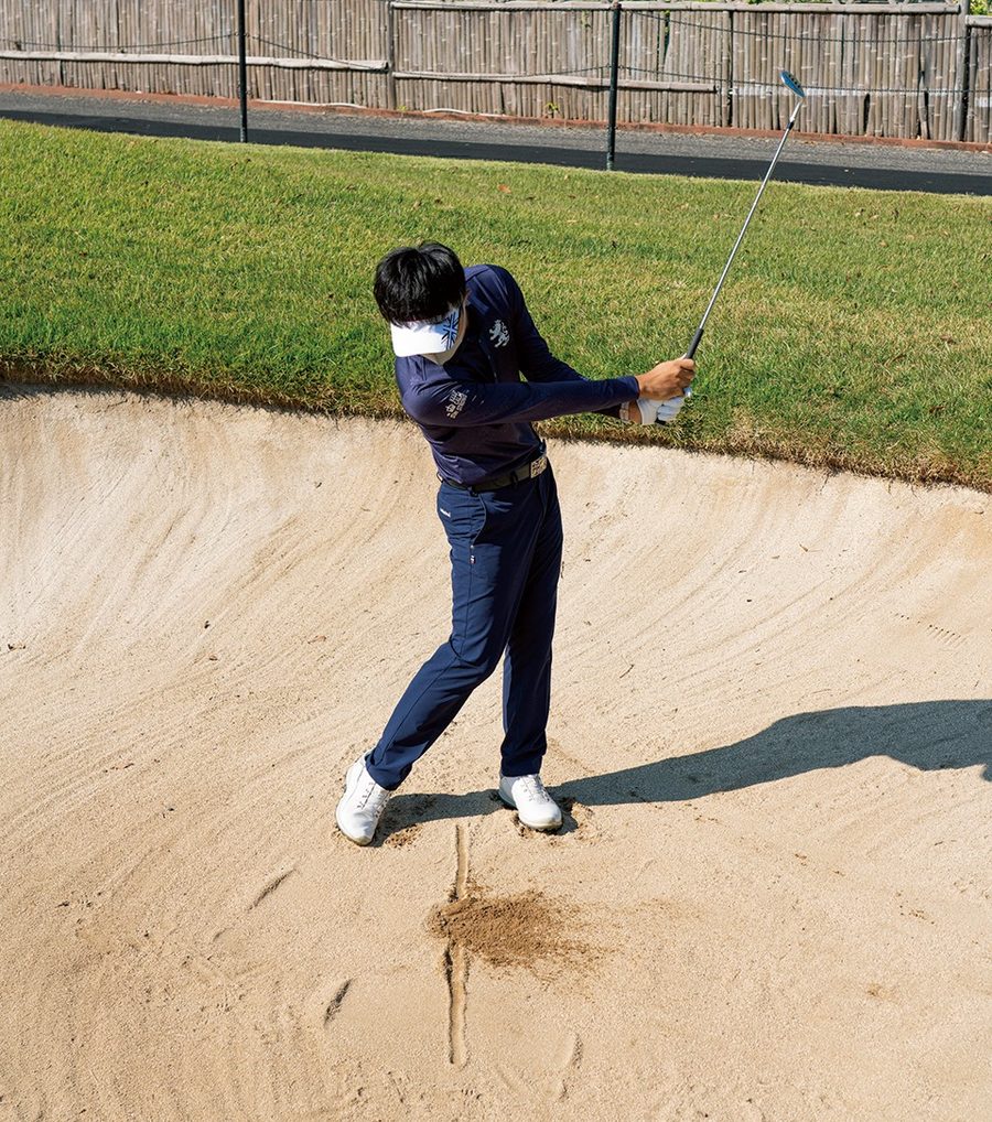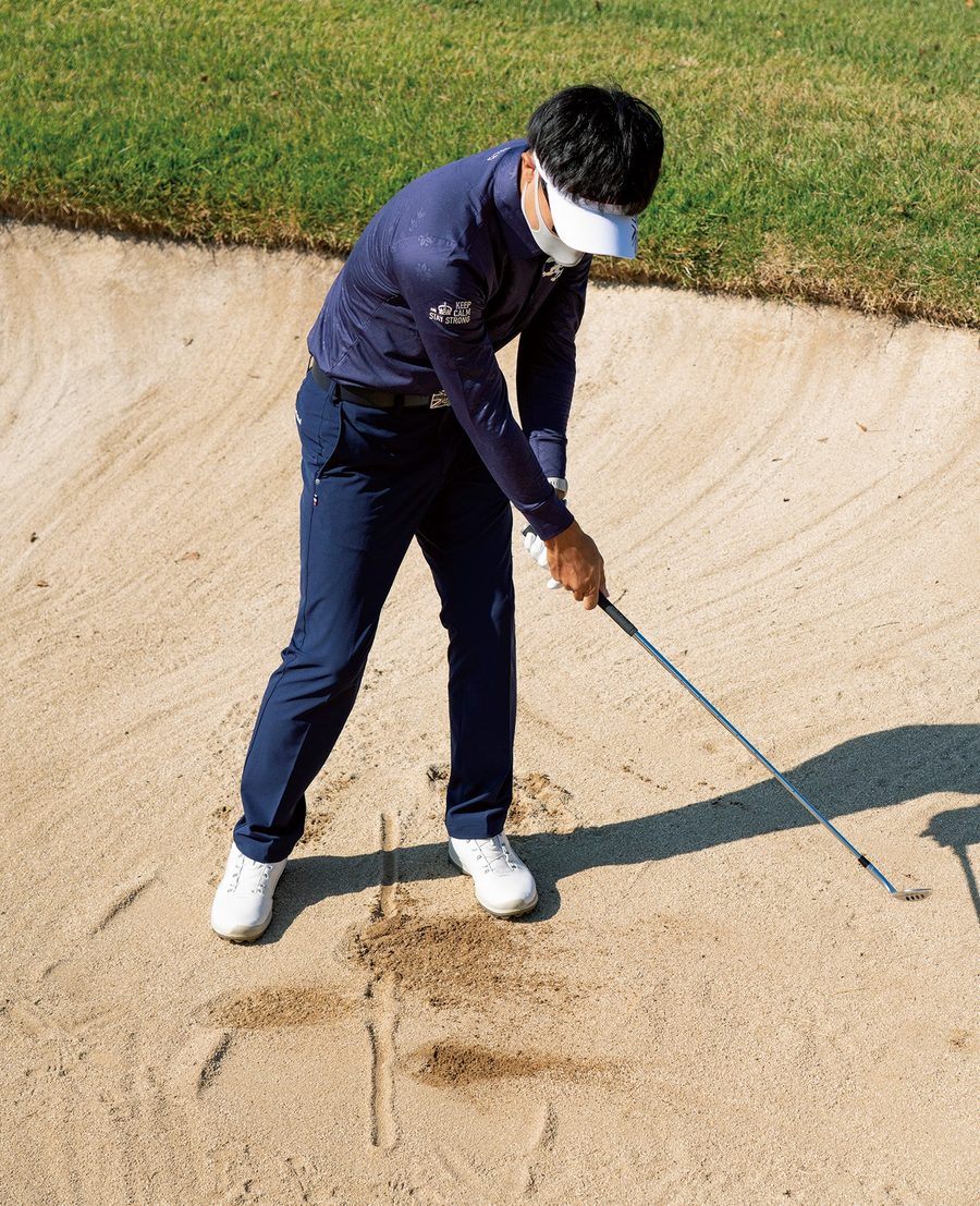 バンカーに一本線を引き、そこにボールがあると仮定して打つ。約10センチ手前を打てればOKだ。砂もちょうど良い量を取ろう。