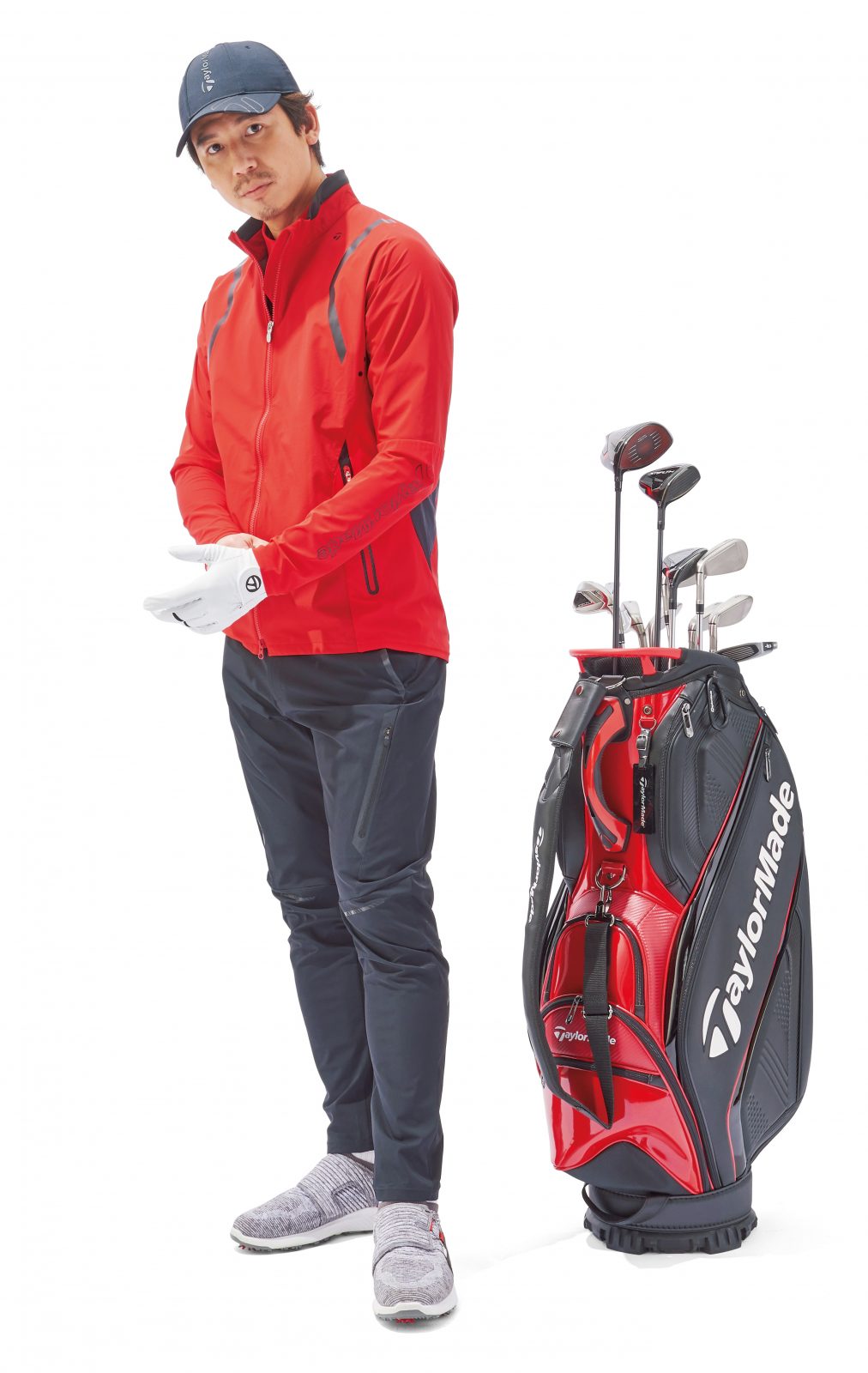 [TOUR TAYLORMADE]辛口なアスリートルックは、体の動きにシンクロするよう研究され、スムーズに快適に動かせる高機能ウエアを実現。キャップ:4,400円、ジャケット:30,800円、ポロシャツ:19,800円、パンツ:22,000円、ソックス:1,320円、グローブ:1,540円、キャディバッグ オープン価格(すべてテーラーメイドアパレル)。