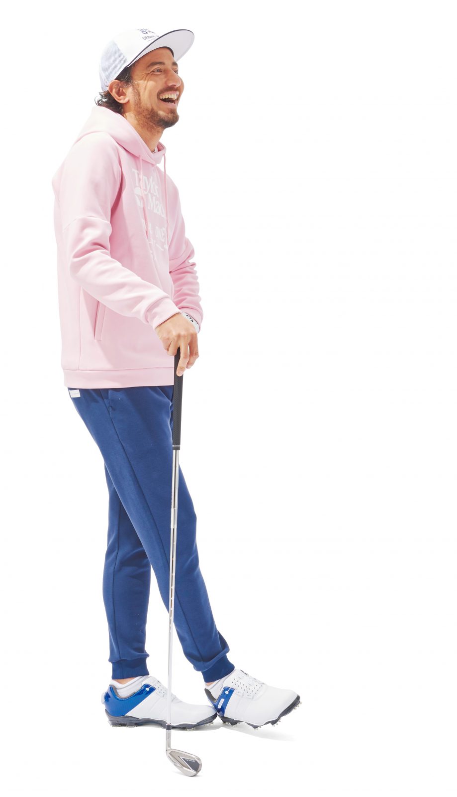 「ゴルフの行き帰りでもそのまま着用できる配色コーデが魅力的。日本人の脚に合ったテーパードシルエットが、美脚をメイク!」