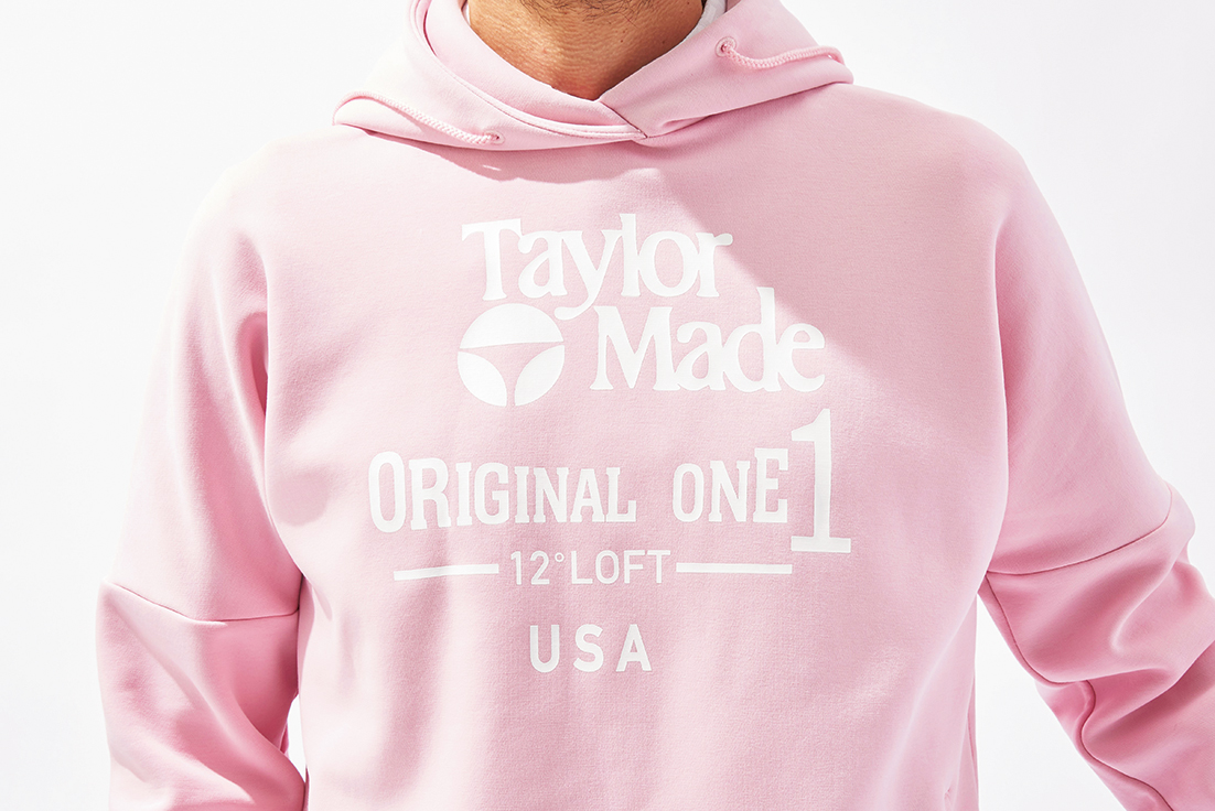 [CLUB TAYLORMADE]前はブロックショルダー、後ろはラグランスリーブを採用したパーカは、機能性が◎。90年代までドライバーに使用していたクラシックロゴをフロントに。キャップ:3,850円、パーカ:14,300円、ポロシャツ:15,400円、パンツ:13,200円、ソックス:1,320円、グローブ:1,540円(すべてテーラーメイドアパレル)。