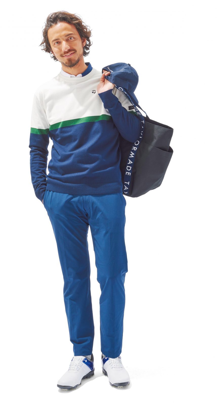 [CLUB TAYLORMADE]クルーネックニットは、ポロシャツとの重ね着を想定した、ややゆったりシルエット。すっきりした配色が好感のある印象をメイク。ニット:17,600円、ポロシャツ:11,000円、パンツ:12,100円、手に持ったキャップ:4,400円、ソックス:1,760円、バッグ:オープン価格(すべてテーラーメイドアパレル)。