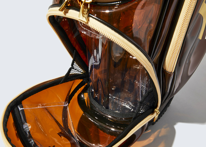 お気に入りのポイントは更にございまして、細部のパーツです。ファスナーの務歯やテープのライトブラウン、スライダーのゴールドが見事に相まって、見事な高級感を生んでいるのです。様々なカラーのクリアキャディバッグがありますが、ラグジュアリーさでいうとこれを上回るものはないでしょう。