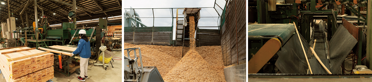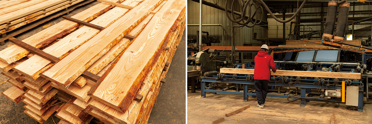 そうやって生まれたエコな逸品。折角の貴重な機会なのでその製造の過程を追うべきであるという結論に至り、ハンガーに利用される檜の端材を扱う製材工場を訪ねた。そこは宮崎県の都城地区にある木材工場で主に杉と檜を扱う、いわゆる大手と呼ばれる大きな工場である。今回の檜の端材を利用したハンガーについて同工場の五十嵐社長に感想を伺った。