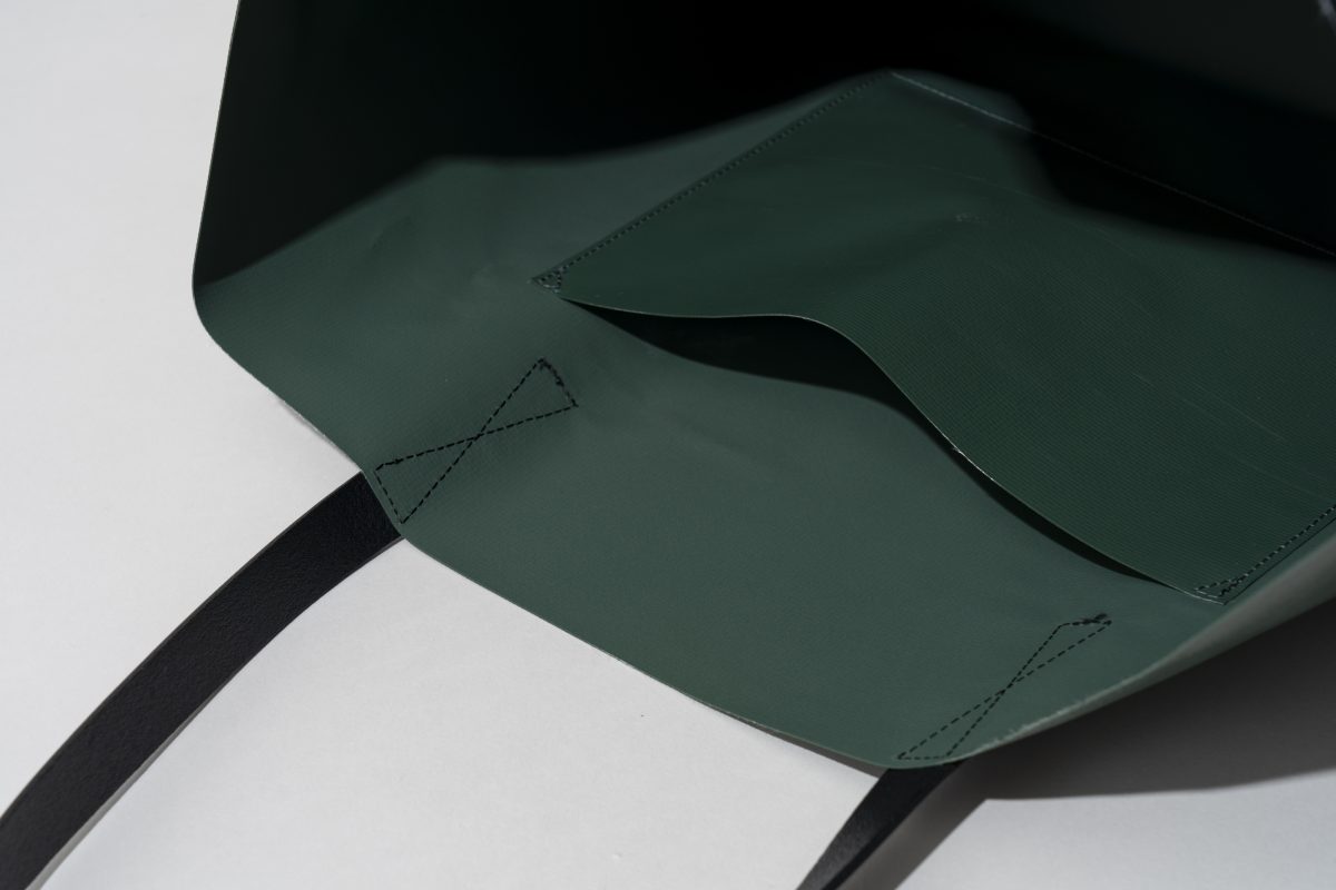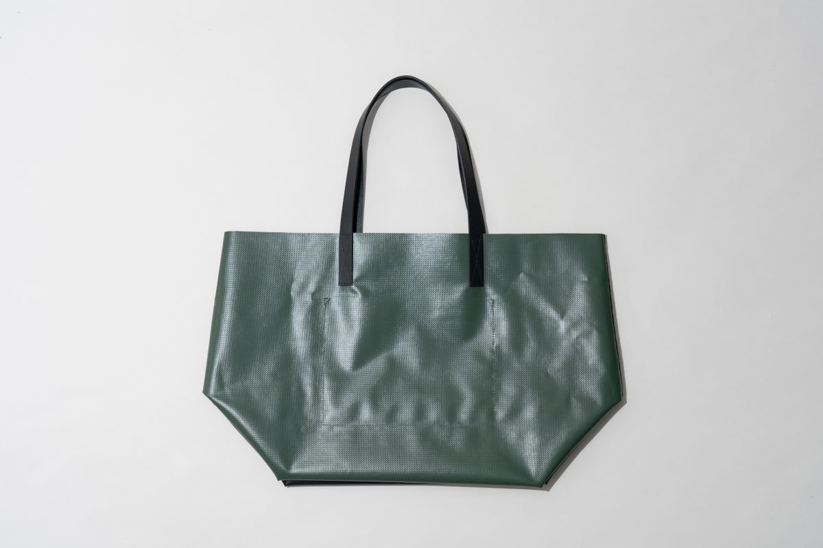 そうやって出来上がったのが、この逸品。PVCのモダンな雰囲気をさらに加速させるかのようにバイカラーに仕上げてくれました。カッコイイ。勿論、たっぷりの容量だし、長めのハンドルはなんと牛革。これがまた絶妙な高級感を生んで全体を大人っぽいテイストに纏めてくれています。当然、PVCゆえに撥水どころか耐水性もあり、非常に軽いので普段使いでも重宝しそう。