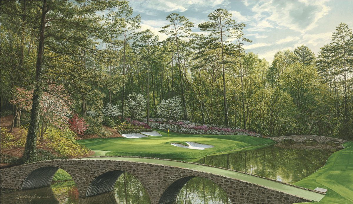 オーガスタナショナルゴルフクラブの12番パー3。優雅に流れるクリークにかかるホーガンブリッジとグリーンの奥に咲き乱れるアゼリアの花が印象的なホール。サイズA(約69cm × 107cm)¥308,000、サイズB(約46cm × 65cm)¥268,000