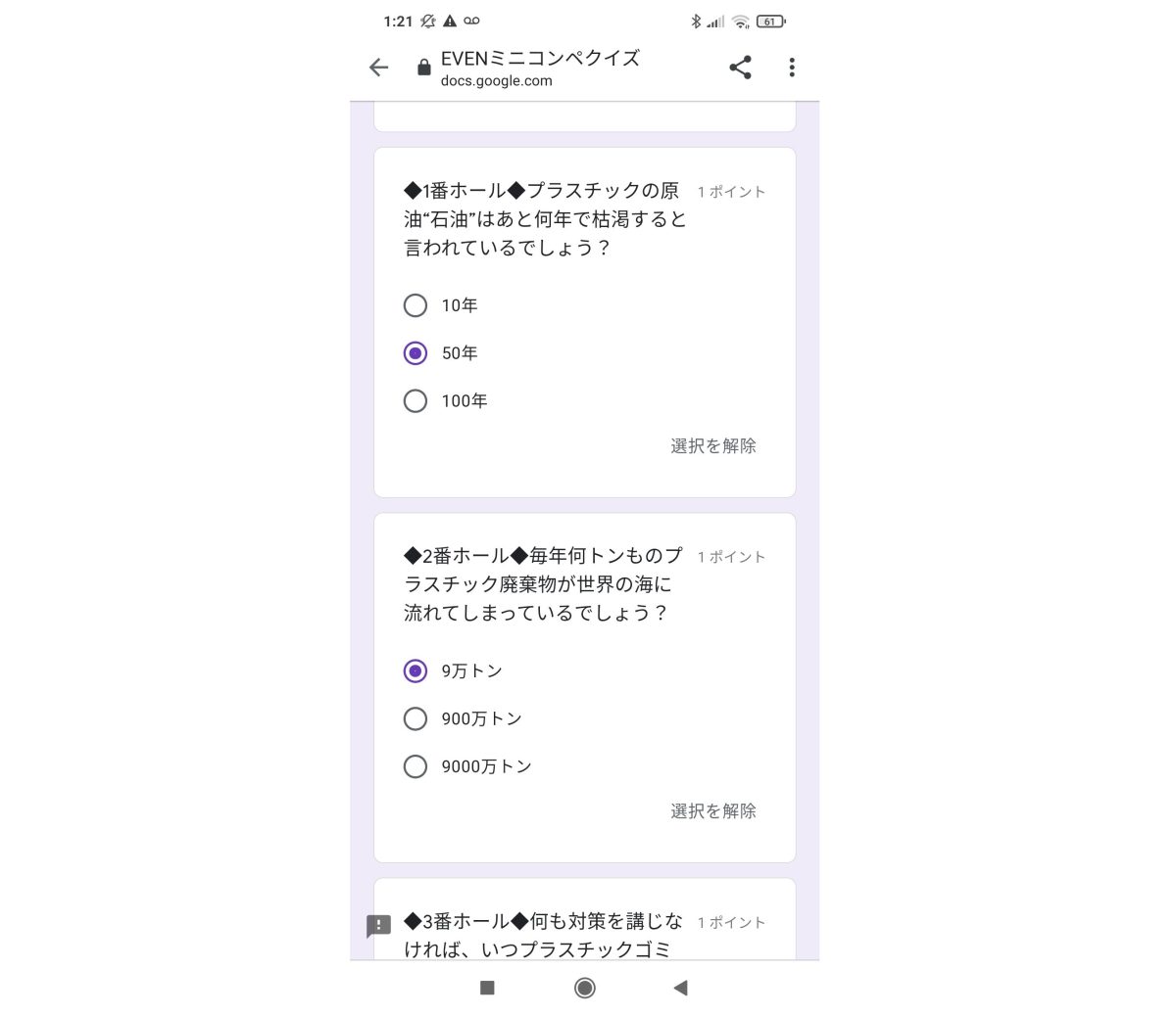 ラウンド中、各ホール毎にスマホを使ってサステナビリティに関する3択クイズを出題。正解数がチーム戦のスコアに反映されるのでみんな真剣。”大きいお友達”どうしがゴルフを通じて、遊びながら少しだけ環境問題への課題を自ら考える仕組み。