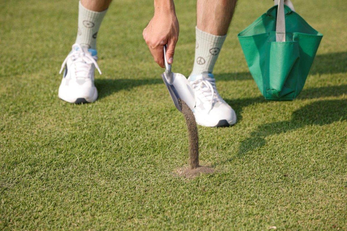 手引きカートによるセルフプレーの茅ヶ崎GL。プレーヤーが目土することで、コース管理の負担軽減や省エネ化が実現できる。ゴルフ場の持続可能な運営に簡単に貢献できる第一歩だ。