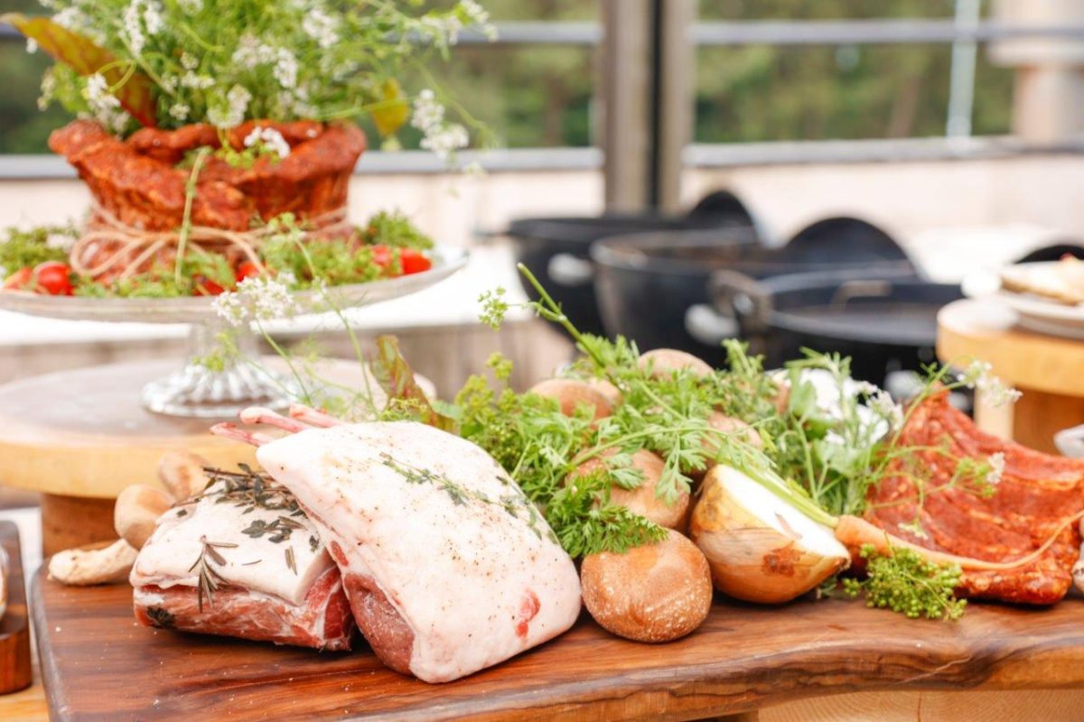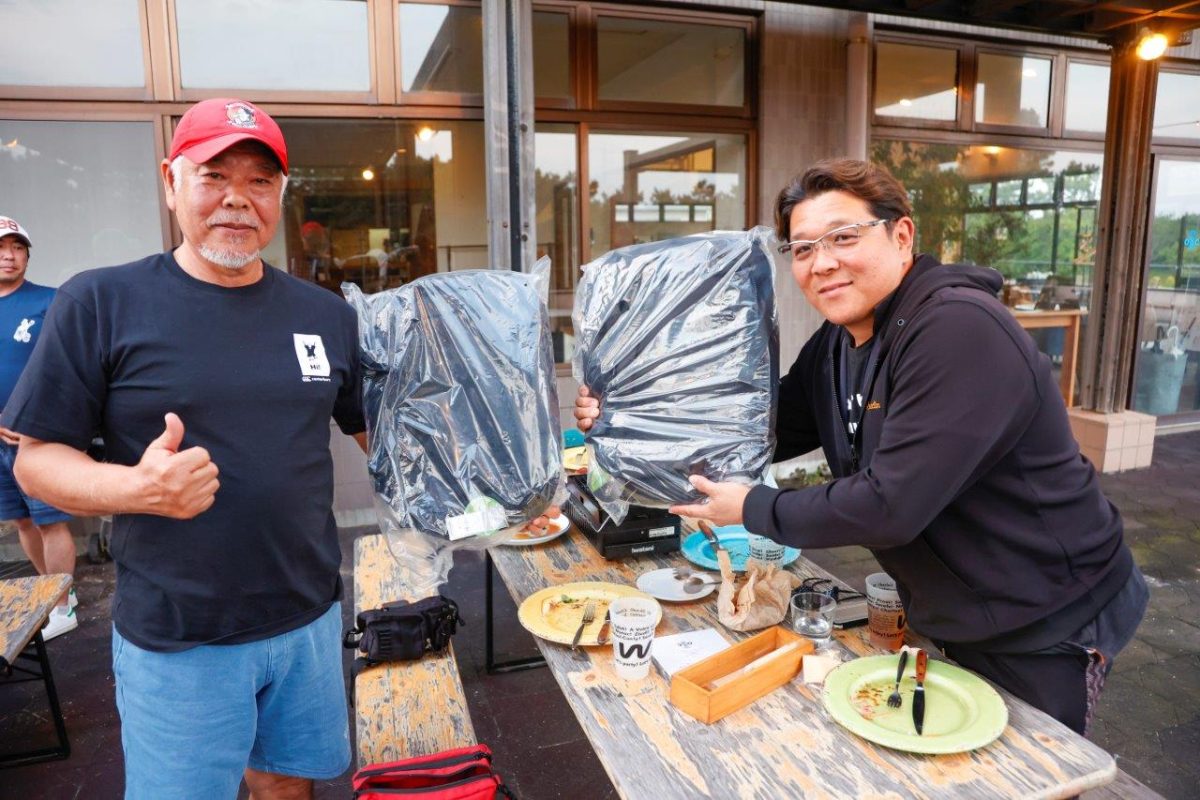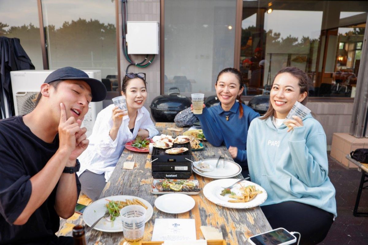 表彰式はテラス席でのBBQ。空調の効いたコンペルームなどに比べて省エネかつ、調理や配膳のスタッフの負荷も軽減。電車でアクセスできるコースなら車も不要でお酒が飲めて盛り上がる。