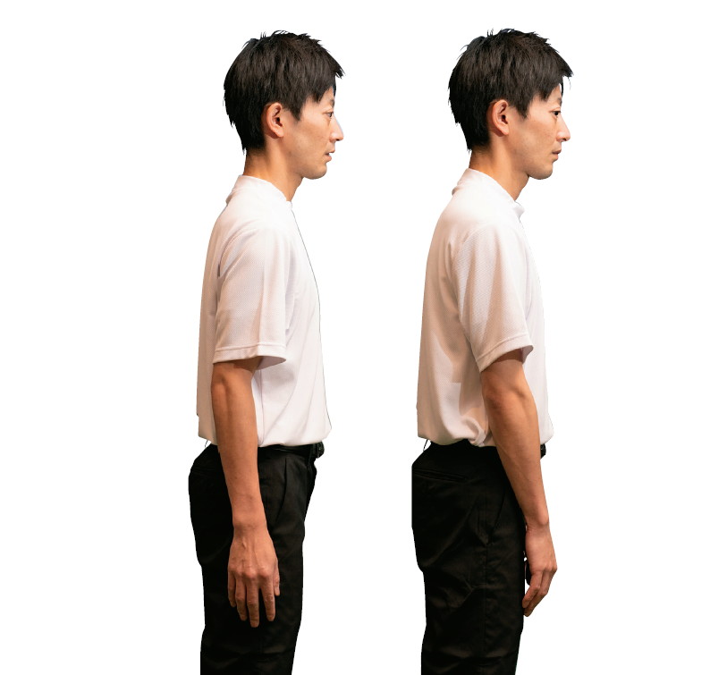 体を横から見た時に、肩の位置が前方に出ている巻き肩の場合、バランスを取るためにカカト側=後方に重心がかかる。反対に肩の位置が後ろだとつま先側=前方重心となる。