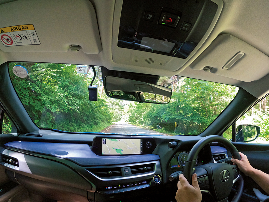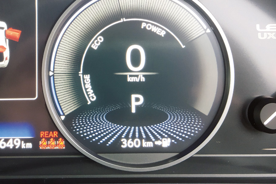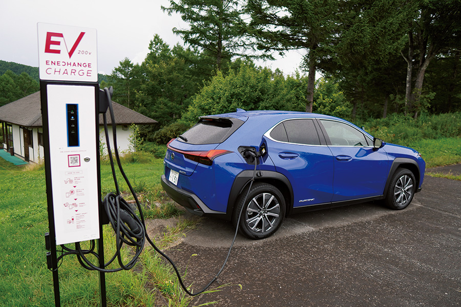 そこで以前から気になっていた『UX300e』を駆り、真夏の遠方避暑ゴルフで実力をテストした。深夜、東京・新宿を出発。この時気温30度、航続可能距離はメーター読みで約300キロ。ストップ&ゴーのある一般道を利用し、電力消費が大きいエアコンもつけて、約180キロを4時間程で到着できた。この時点で航続可能距離は70キロ程に。これは電力消費の激しいワインディングの登り走行が大きく影響した模様だ。