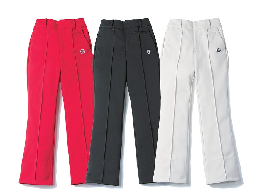 パンツ派に嬉しい待望のアイテムは珍しいフレア形状。派手色ニット以外の色を統一すればこんなハンサムに。ニット帽:5,280円、総柄ニット:30,800円、ハイネックニット:27,500円、フレアパンツ:25,300円(すべてCPG GOLF)。