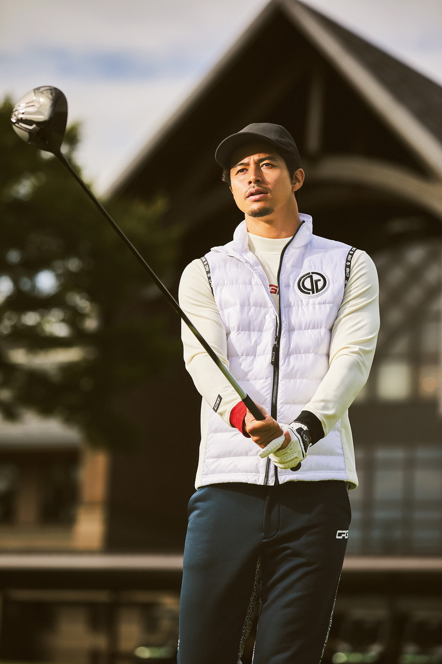一枚で十分暖かなモックネックは袖の非対称カラーが肝要。軽量ベストもスイングしやすい。キャップ:5,830円、ベスト:41,800円、モックネックシャツ:25,300円、総柄ダウンパンツ:38,500円、グローブ:5,280円(すべてCPG GOLF)。