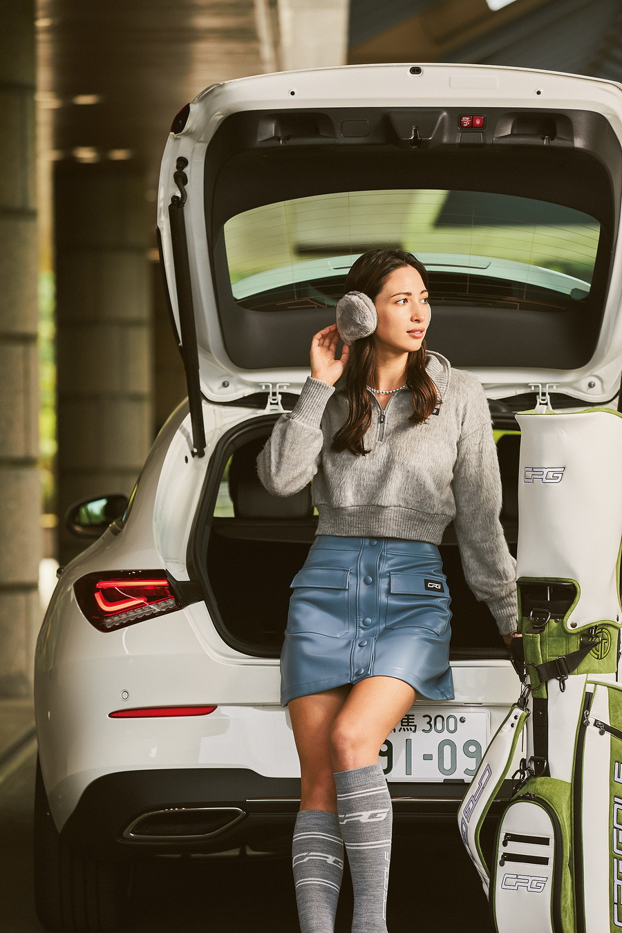モヘアのような素材の丈短トップスに本革調のスカートがお洒落。イヤーマフ:2,860円、プルオーバー:25,300円、ヴィーガンレザースカート:25,300円、ソックス:2,750円、磁気ネックレス[CPG MgOn]:30,800円(すべてCPG GOLF)。