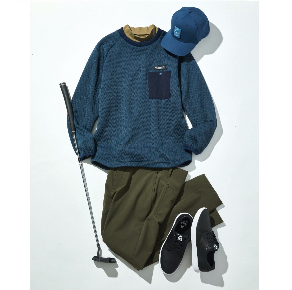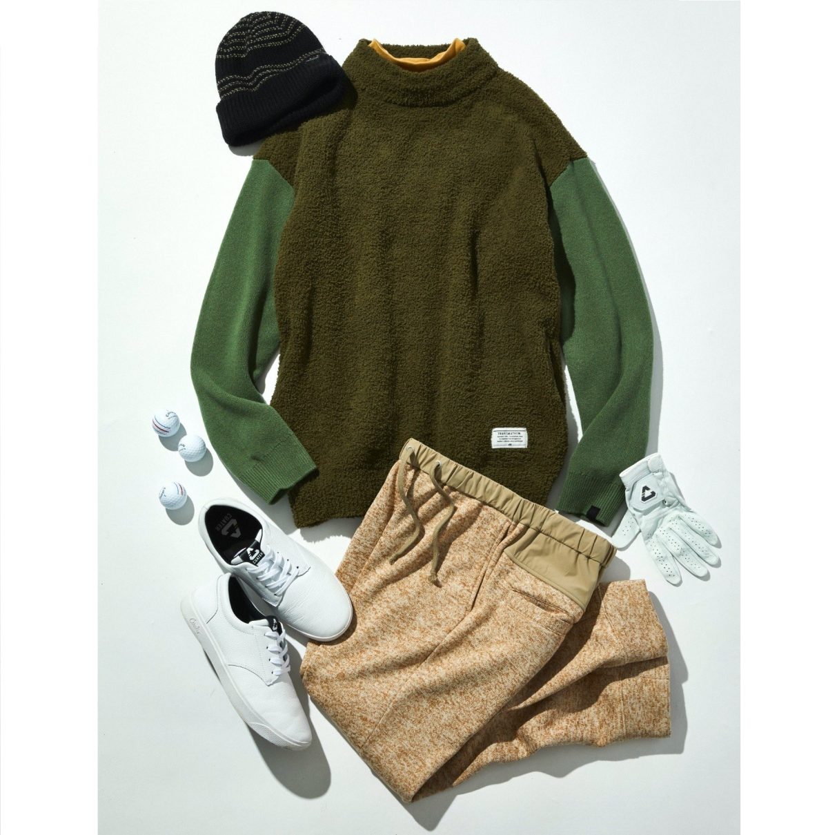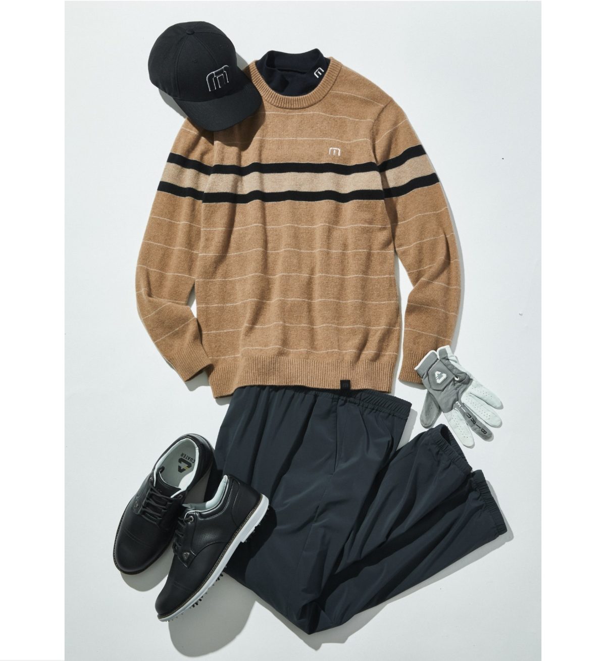 ベージュのカシミアニットをモノトーンの挿し色として使った秋晴れのコースに映える組み合わせ。カラーだけでなく、機能素材のイージーパンツとモックネックでハズし、カジュアル感やスポーティさをプラスするとアクティブな印象に。キャップ4,950円、カシミヤセーター37,400円、ハイネック長袖シャツ13,200円、イージーパンツ19,800円(すべてトラヴィスマシュー)、グローブ4,400円、シューズ33,000円(ともにクウェーター バイ トラヴィスマシュー)