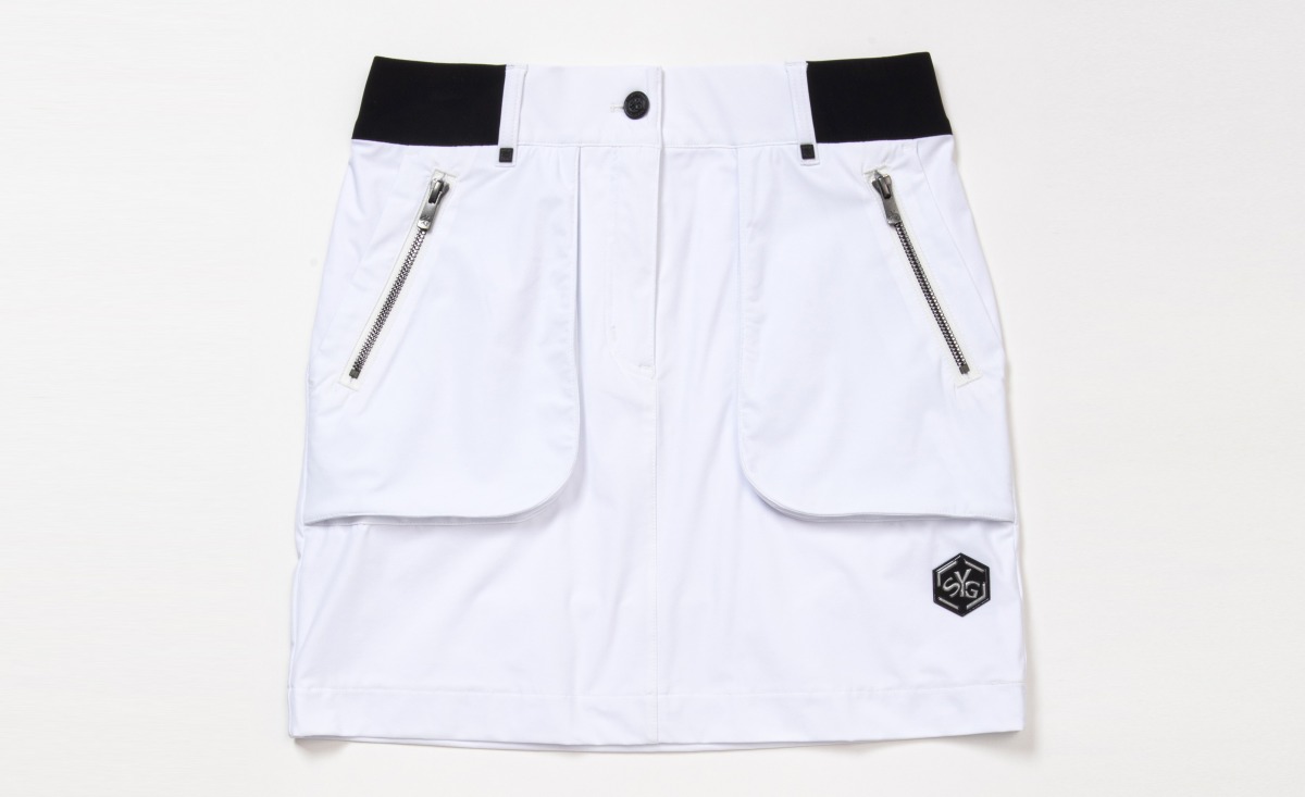 イタリア・カルビコ社の機能素材「REVOLUTIONAL ZENIT」を使用したスカート。エレガントな見た目と機能性を兼ね備えたテクニカル素材。裏面にはメッシュ素材で防透け処理を施し、フロントのメインポケットにはマチ付きのデザインポケットを採用。収納力が不足しがちなスカートをゴルフ仕様に昇華している。