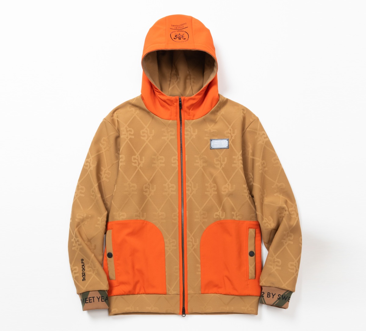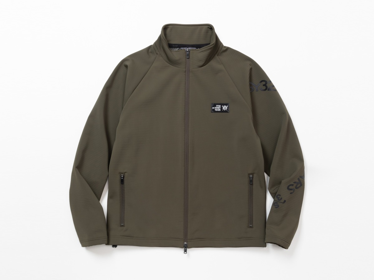 表地側で防風性、内側が保温性を備えた素材の組み合わせによるボンディングフリース素材を使用したフルジップジャケット。ストレッチ性が高く、肌離れが良く防風、保温蓄熱機能にも優れ、裏面にブロック状の起毛を用いた機能素材が特徴。左袖に入るステンシルを思わせるアーチ型のロゴプリントが印象的。