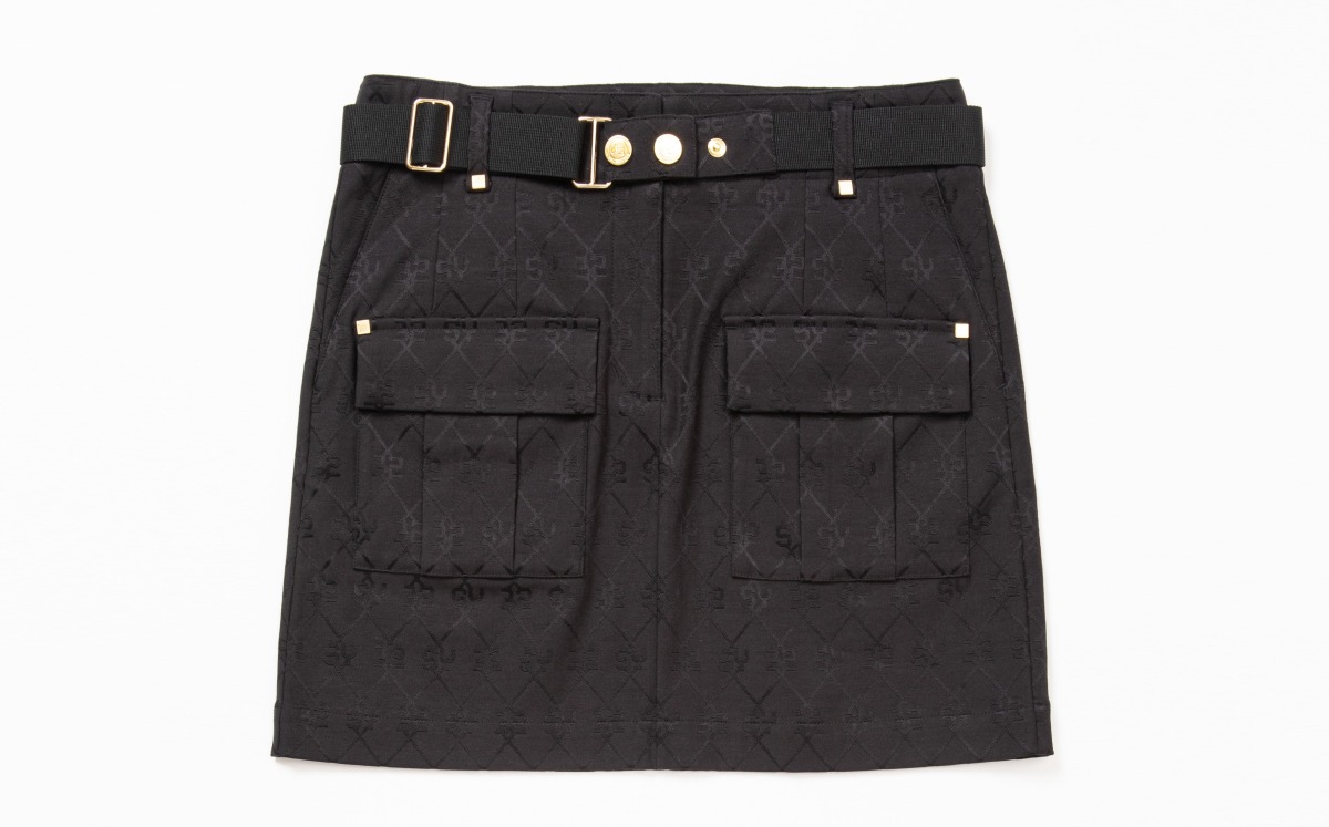 ブランドロゴをモノグラム調に配したオリジナルジャガード素材を使用したスカート。フロントにはマチ付きのデザインポケットを採用、通常のポケット、背面のポケットと合わせてゴルフ小物を整理して収納しておける。トーン控えめな同系色の総柄デザインなので、パターンオンパターンの着こなしなど、着まわしやすさも魅力的。