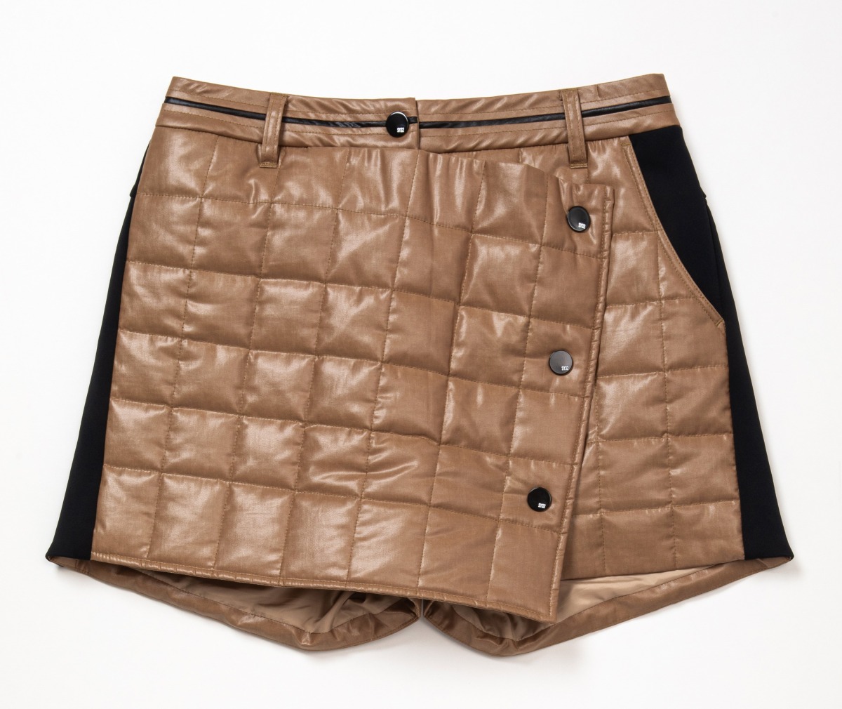 ウェットで艶っぽい光沢感のビンテージレザー調ポリエステル素材を使用したキルティングキュロットスカート。一見巻きスカート風のデザインと小ぶりなブロック状のキルティングがかわいいが、中綿に防風性に優れた 「サーモライト」を使用するなど、防風保温機能もしっかり押さえた高機能ウェアだ。カッパー風の色合いも上質。