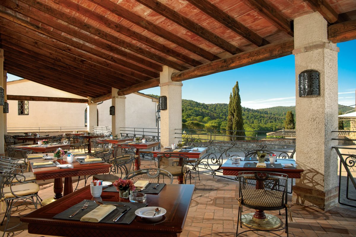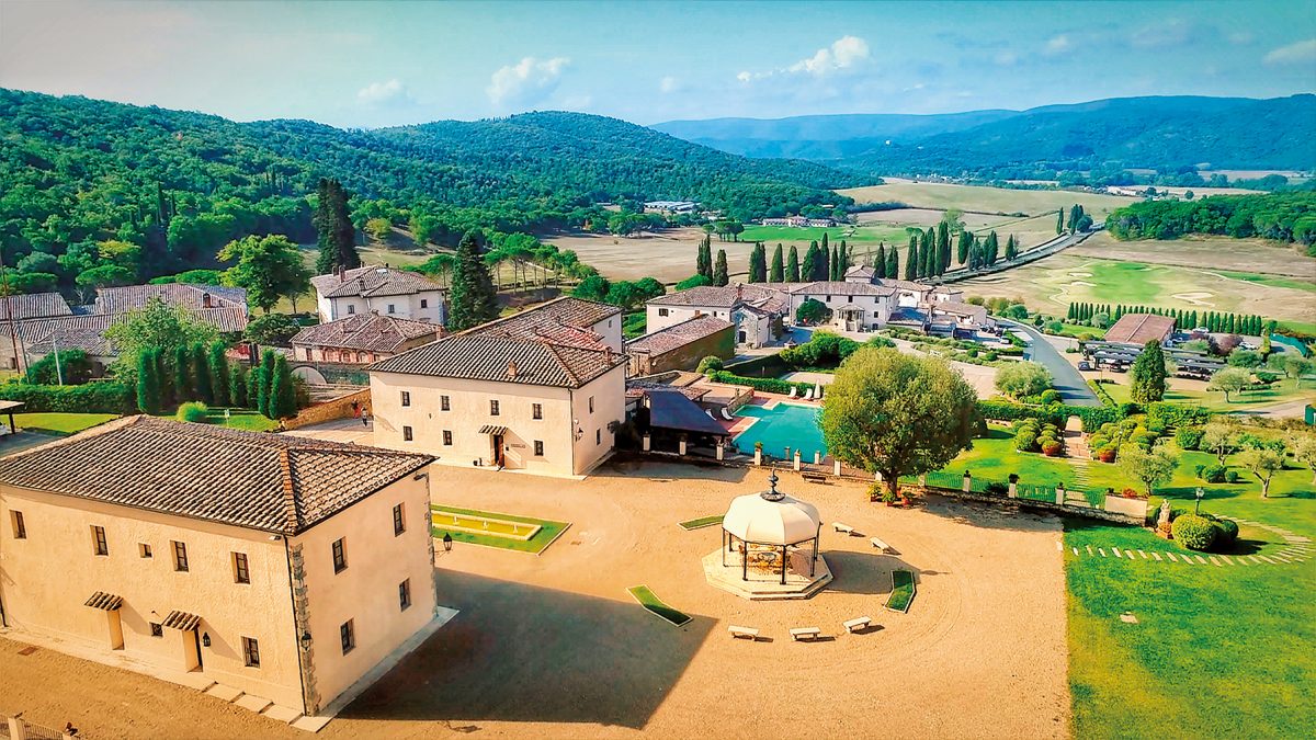 そのシエナから南に約15キロ。トスカーナの自然の中に、突如として村のようにも見えるゴルフリゾートが現れる。それもそのはず、このリゾートは1000年前から繁栄していた村の古い家屋や教会、古代浴場をリノベーションして生まれたリゾートだ。