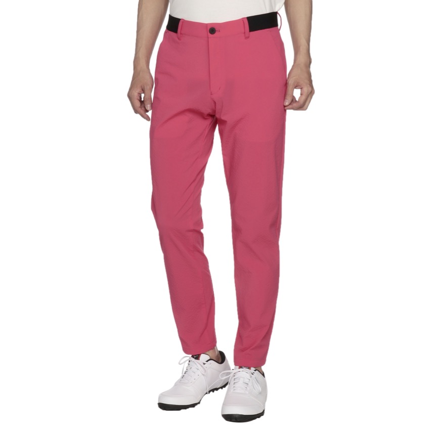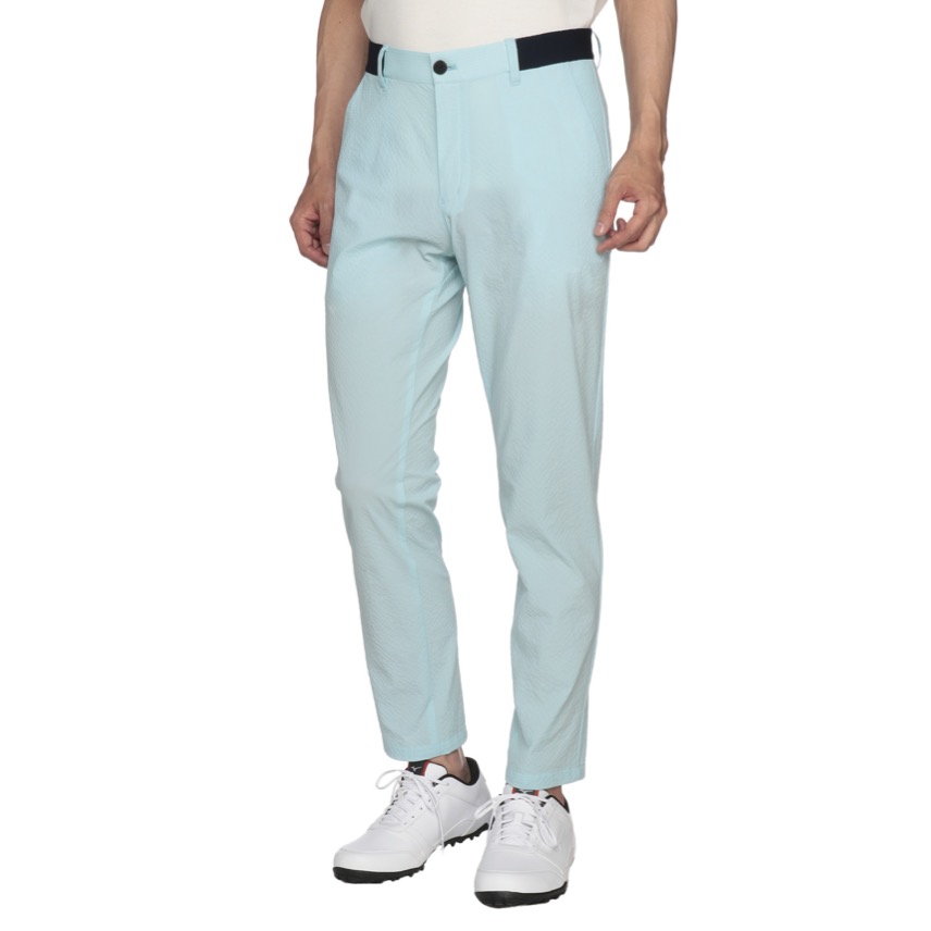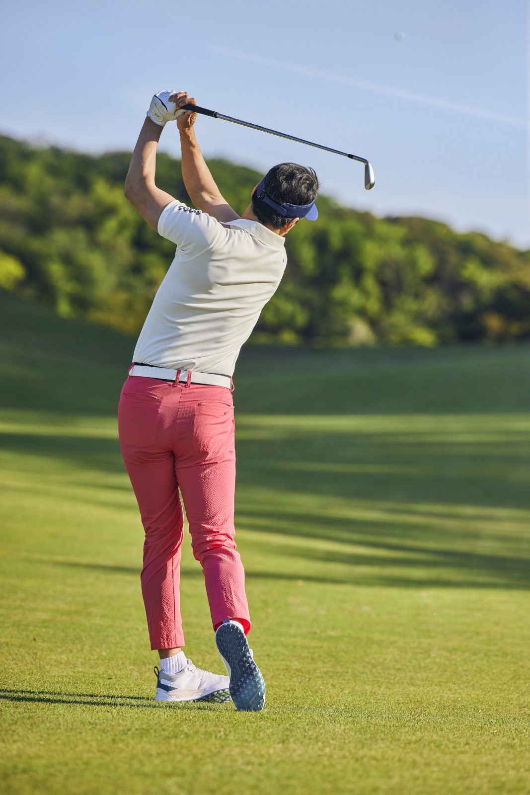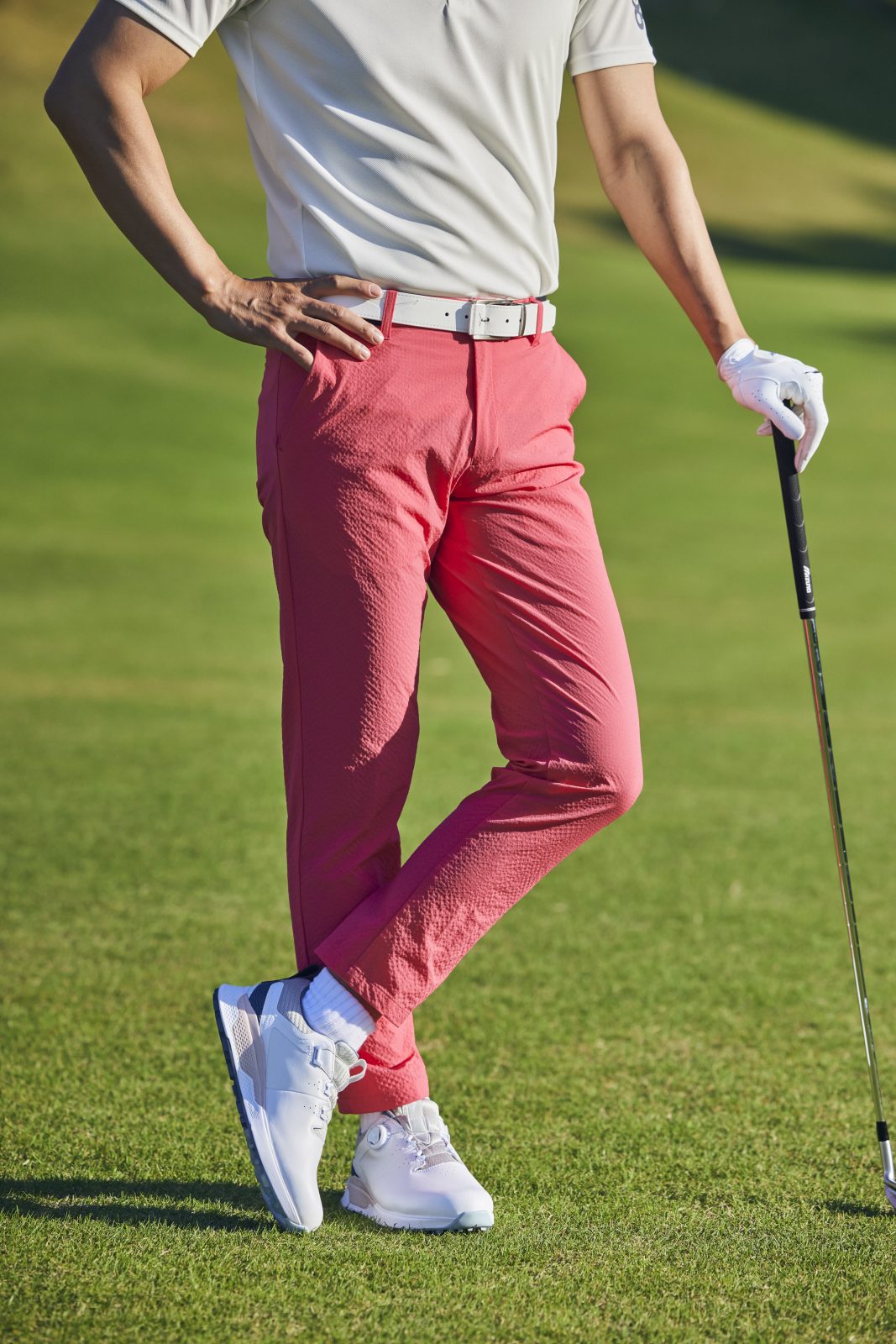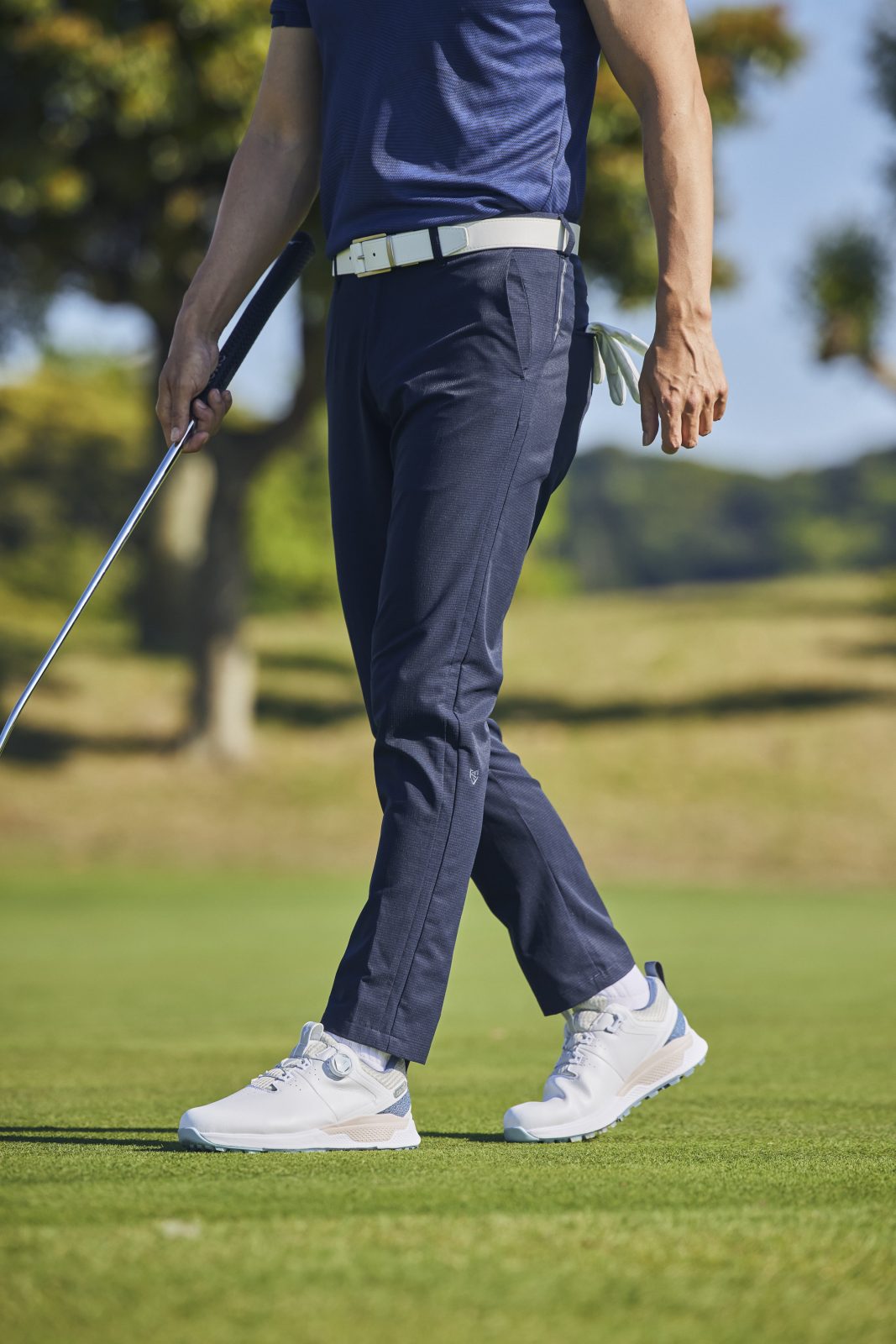 スタイリングを見た印象もテーパードが効いているので脚長効果も感じられる。撥水加工されたメッシュ生地で通気性が高く、タフな暑さが伴う時期に大活躍は間違いないだろう。「あと、個人的に気に入ったのが腰回りの立体裁断。フィット感が良いのでスイング時に動きやすく、生地の突っ張るようなテンションを全く感じないのもポイントが高いですね。」(ロランさん)