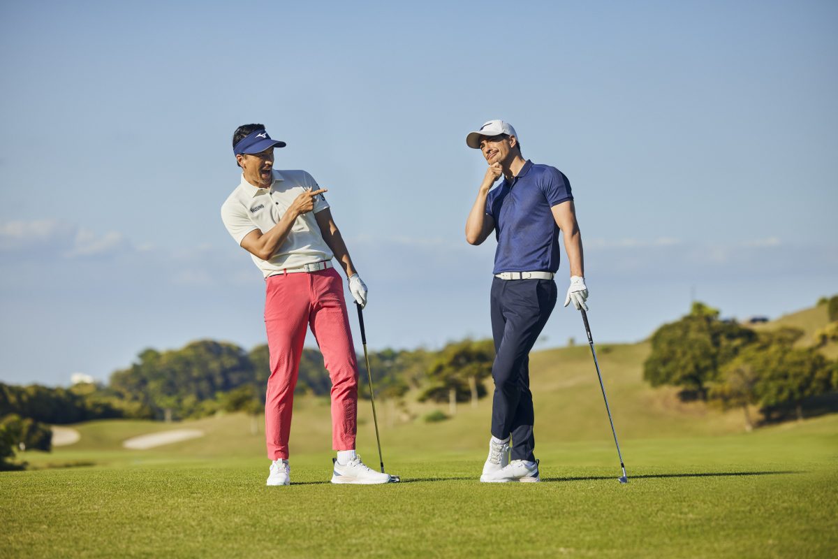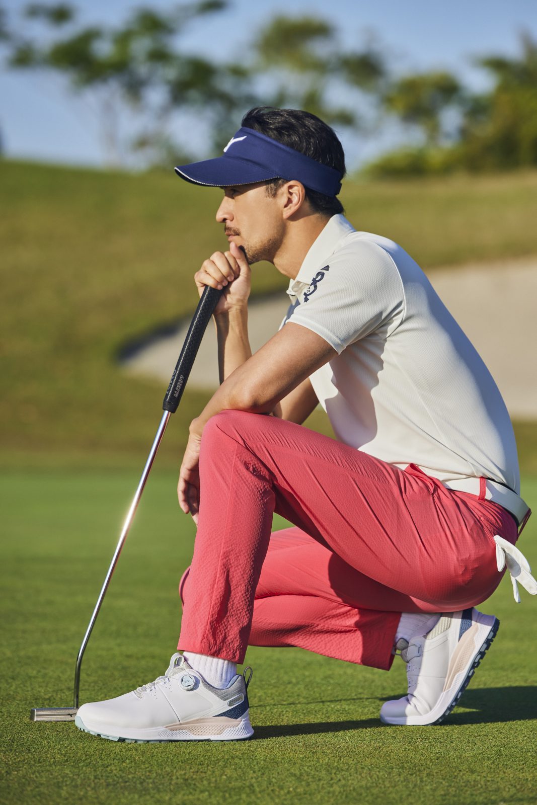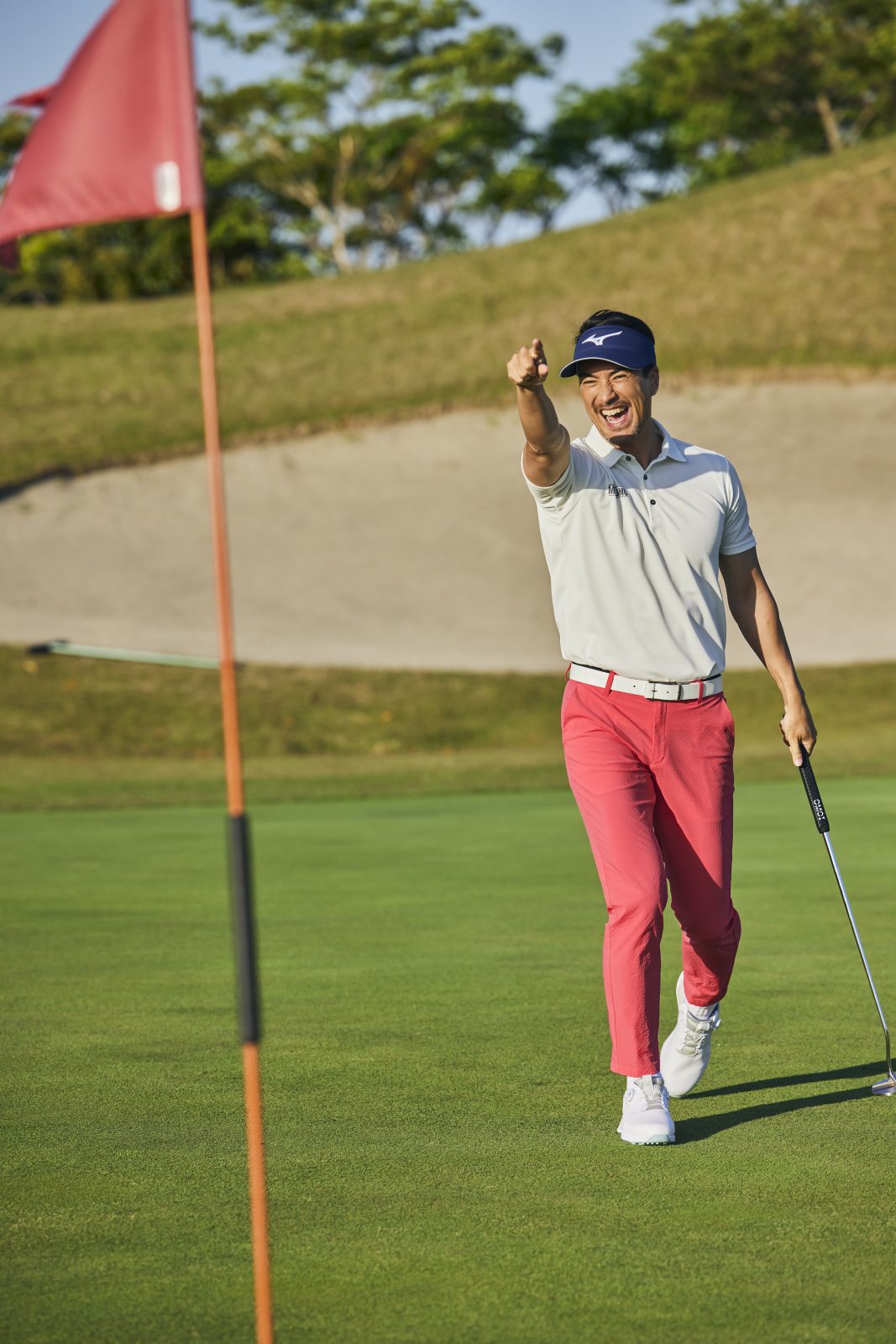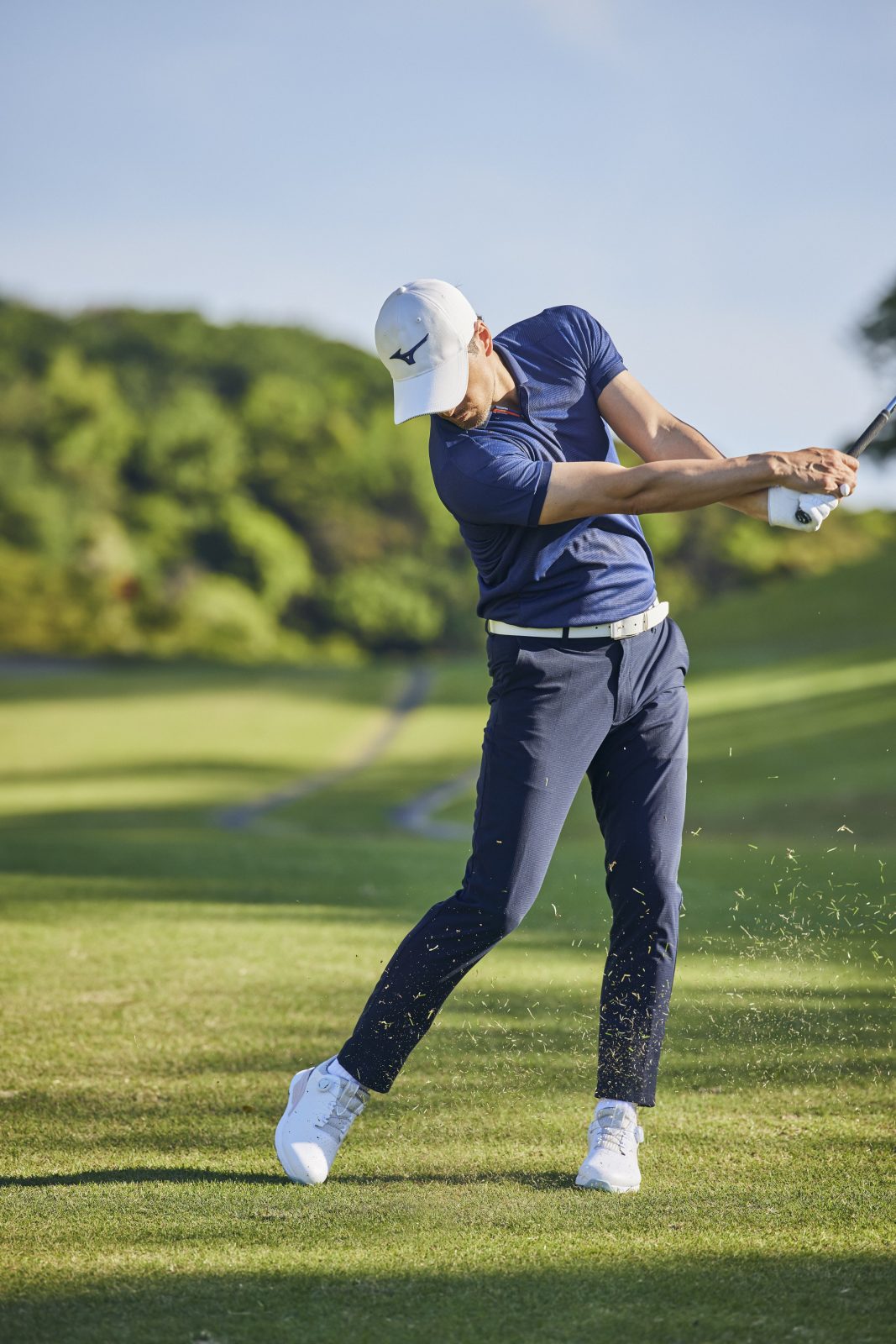 実際に履いてもらいプレーをしているのを見た印象は、とにかくストレッチ機能が快適そうである。「ミズノ」の合わせ持つアスリート顔も相まって、コース上ではやはりまるでツアー選手のようなかっこよさだ。モデルに尋ねれば、履き心地はノーストレスで、見た目以上に伸びるから、ゴルフの動作に対する反応がよく、いつものサイズのパンツを履くだけで驚くほどピタッとおさまりがとてもいいとの事。