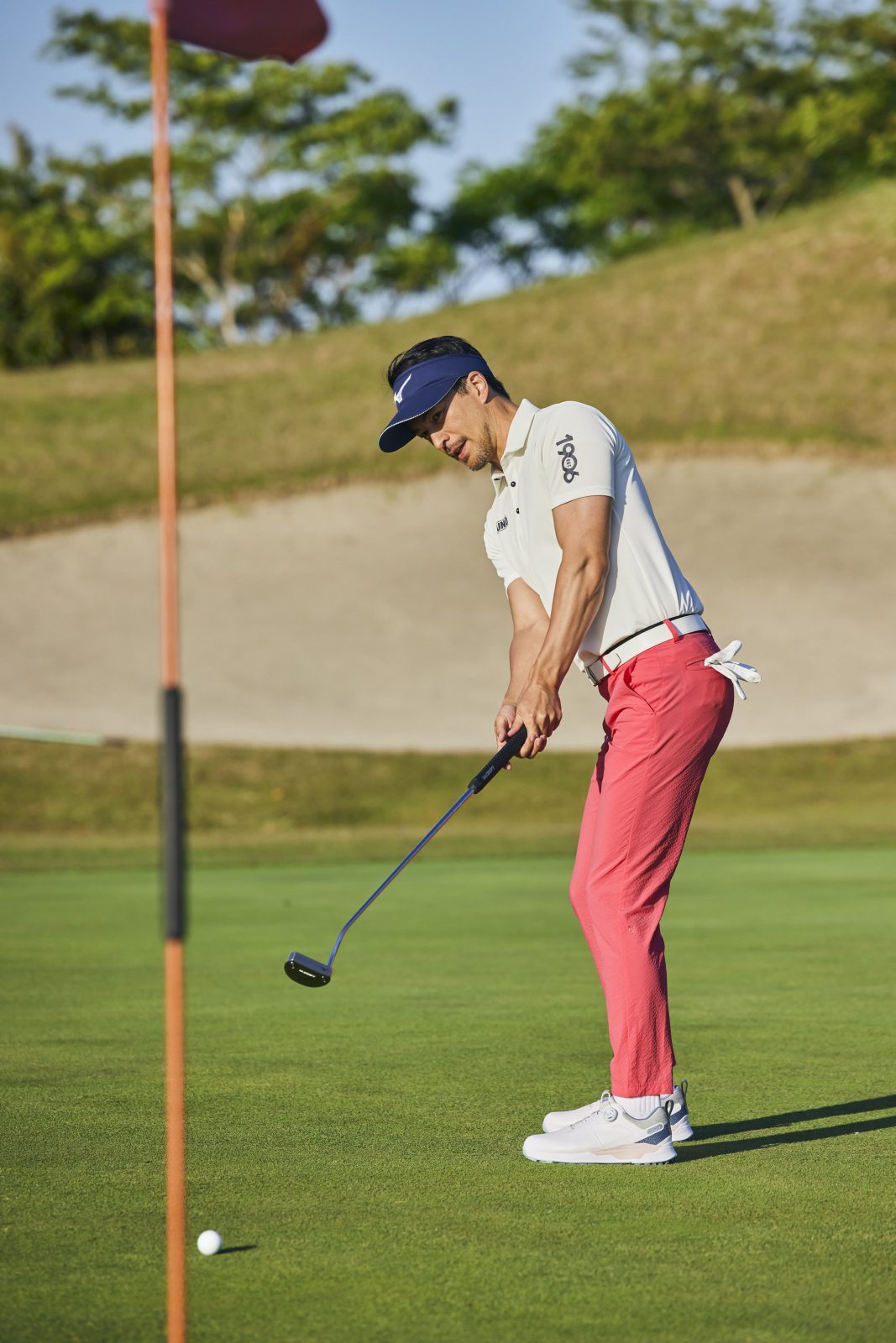 続いて着用してもらったのは、人気の「驚着極伸パンツ」だ。”伸びて戻る”、”360°伸びる”という事で、全方向にストレッチが効いている。そして、その生地が5秒で95%以上が復元する回復力で、文字通りに秒で“伸びて戻る”驚きの機能性。ラウンド中の様々な動きにストレスもなく、カジュアルかつタフな素材感で、様々なコンディションに対応できる。こちらもきっちり今時のシルエットを出しつつ、モダンな顔つきを持ち合わせている。色バリ、サイズも豊富なのでより多くの人に履いてもらえる事だろう。ウェアの機能性のアシストでプレーに集中できるとともに、スタイリングも楽しめる事でゴルファーとしての気持ちが昂る着こなしができるはずだ。殊、集中力も高まるグリーン回りにおいては、動きやすく快適な履き心地を実現し、言わずもがなプレーに集中できるのは間違いない。