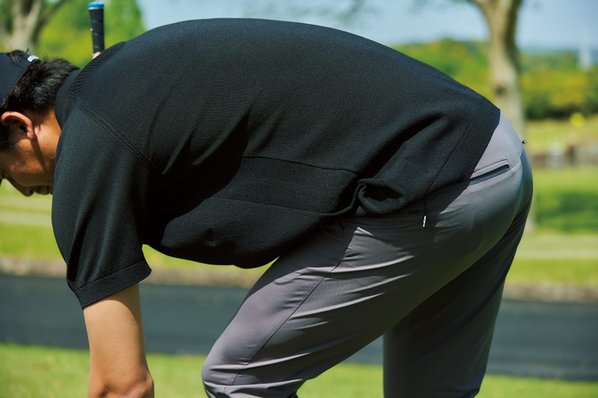 無縫製で立体的に編み上げるホールガーメントのニットポロ。脇部分の編地切り替えや、肩のラグランスリーブなど快適に振り切れる仕様。パンツには高ストレッチ性を持たせ、座ったりしゃがんだりが快適。