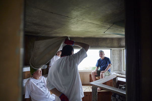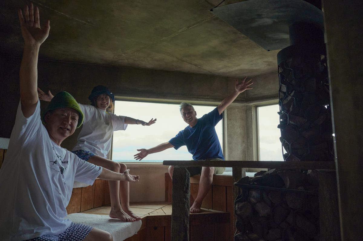 アロマ水の香りが室内を漂い、良い匂いと熱気が充満。室内の一等地は海が見渡せる窓際だが、3段あり5~6名くらいまで収容可能。ガスや電気ストーブと違い、薪が良い空気感を生み出してくれる。5分もすればもう汗だくだ!!