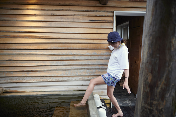 サウナ室以外にも、良いサウナに必要とされるのが水風呂と、外気浴スポット。地下水を汲み上げ、冷たいながらもまろやかな肌触りで心地よい。サウナ初心者のあやなぴんは10秒浸かるのが精一杯……。