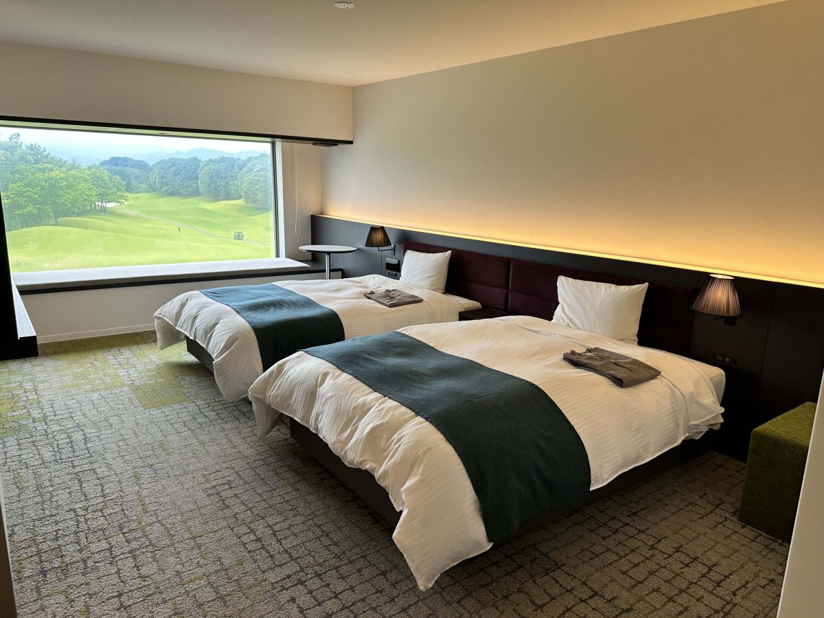 クラブハウスとは別棟に位置するホテル、ヴィラは合わせて最大88人収容可能。部屋のタイプもシングル、ダブル、ジュニアスイートなど豊富にラインナップしている。部屋は1室あたりの料金設定なので、ジュニアスイート(上写真参照)も2人で泊まれば1人あたり20,000円程度(プレー代は別。宿泊プラン、時期によって異なる)で泊まれるのがうれしい。