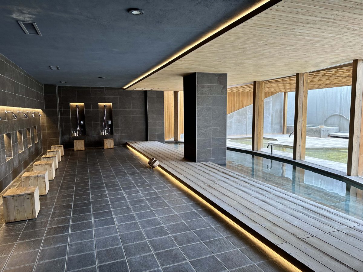 男女ともに室内と露天の天然温泉に加えて、ゴルフボールを彷彿させるデザインのサウナが、ラウンド後の疲れた体を癒してくれる。
