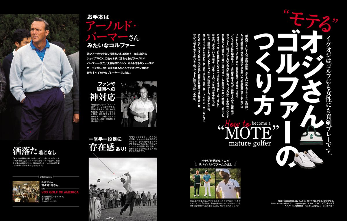 ファッション特集のテーマは、ずばり“イケおじ”です。『おすすめのブランドやアイテムは?体型別の着こなし方は?』『シューズやサングラスの合わせ方は?』などなど、世のおじさまゴルファーの疑問にずばり回答します。