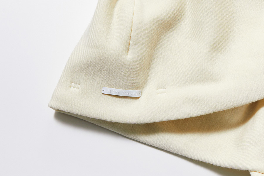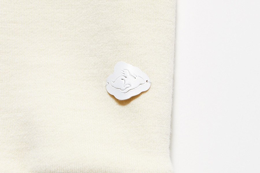 で、この冬の目玉といえば、10万円オーバーの超高級カシミヤ裏毛のスウェットである。サンプルを送ってもらったのだが、ズッシリと重みのあるそれは肉厚に作られ、袖を通すとすごく気持ちよく暖かい。見た目はいたってシンプルなパーカ。胸元のロゴや、袖口に添えられたフライングラビットは同色でさりげなく。細部まで見渡しても高級感が漂う雰囲気に。