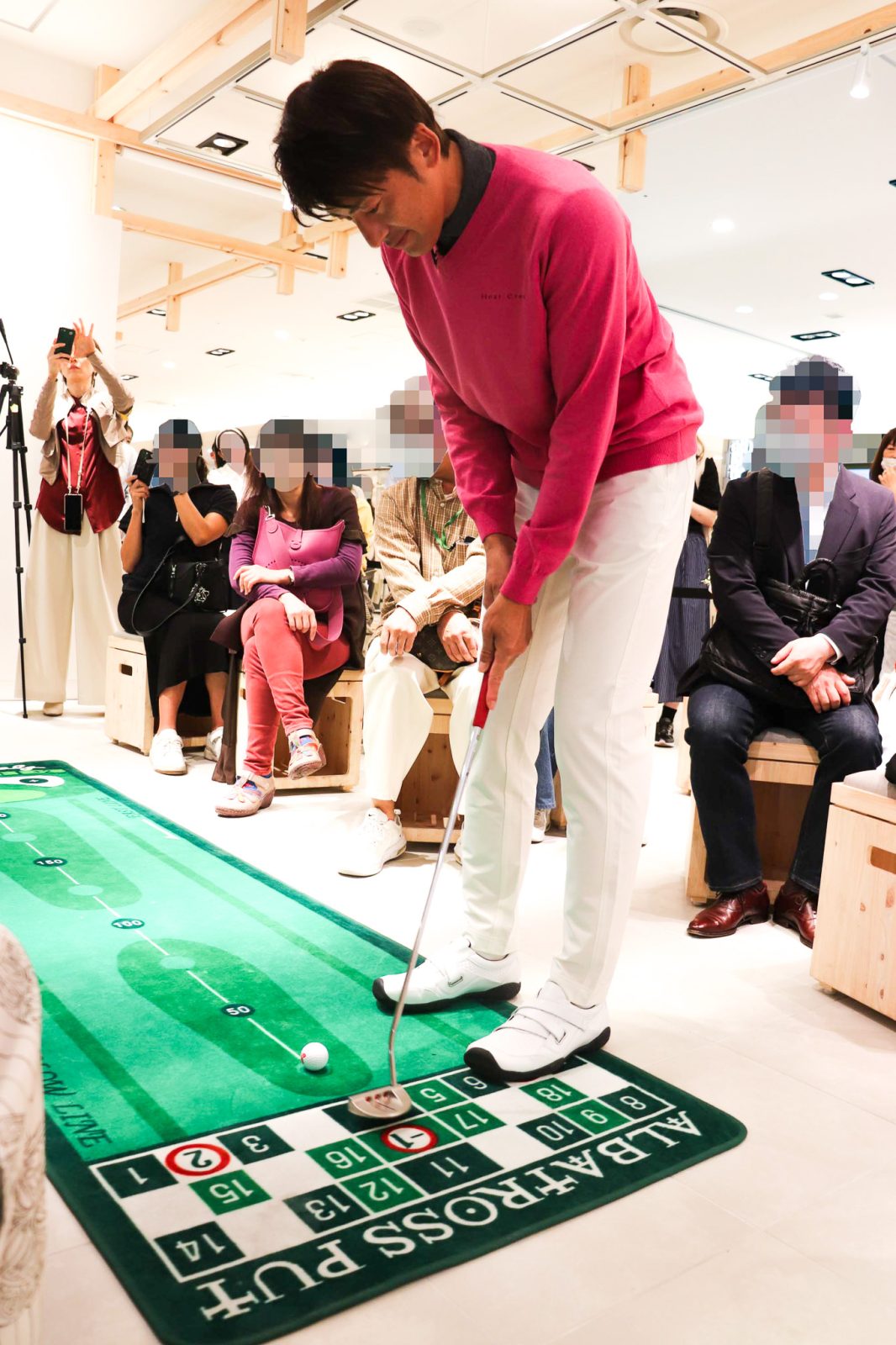 トークショー後には、当日抽選で当たった2名が能見さんとサイン入りグッズを賭けたパター対決。レフティである能見さんは自前のパターを持参し勝負に挑むも苦戦し、「全然入らへんやん!」と心の声が漏れる場面も。最後にはヒールクリークで事前購入された着席参加者とツーシ