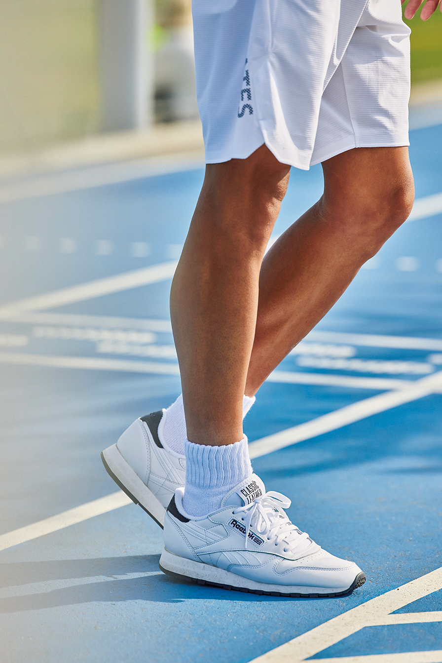 グラスホルダーはネオンカラーを挿し色にちょい足し算。シューズはアッパー部分がレザー使いだからハイテクに見えすぎないように引き算。