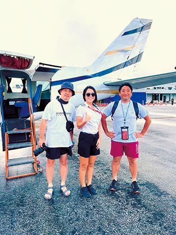 取材当日のフライトを担当したのは日本人パイロットのカナエさん。シミズ&トリイと共に笑顔でパシャリ!