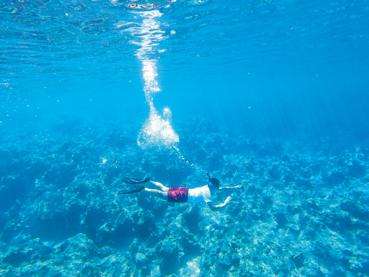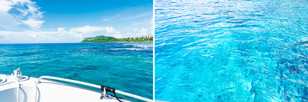 そのうちの一人であるスキューバセンター「RUBIN(ルビン)」代表・山本さんのガイドのもと、イーストマリーナからボートに乗り込み沖に15分ほどのエリアに広がるポイント「コーラルガーデン」でシュノーケリング体験。太陽の光と海が織りなす「ロタ・ブルー」は、時間を忘れて漂いたくなる別世界。