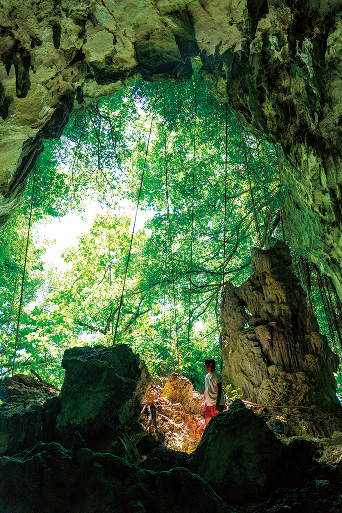 ソンソン村展望台の下にあるのが、島内の名所として知られる「トンガケーブ」。トンガの移住民が住んでいたといわれ、太平洋戦争時には日本軍の野戦病院としても使われていた鍾乳洞は、凛とした空気感が漂う神秘的な空間。
