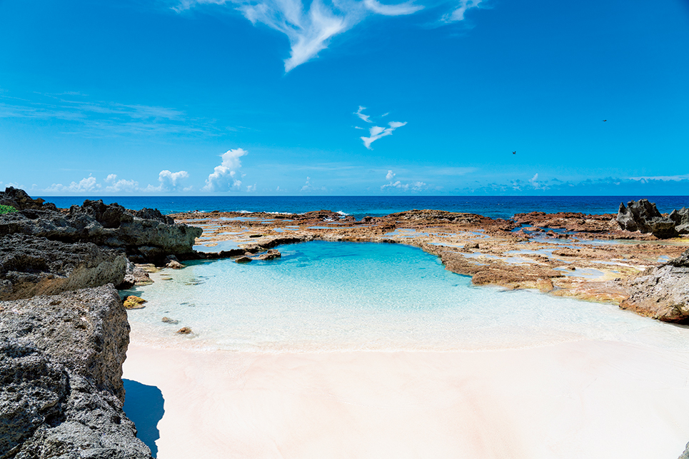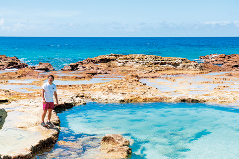 南国特有の木々が生い茂る一本道を抜けたプライベート感満載のビーチにある秘境スポット「スイミングホール」。 自然が作った岩礁穴に湧き出す真水と海水が混ざり合った天然プールと紺碧の海、岩礁が織りなすコントラストは 絶景。訪れた干潮時には、岩礁に取り残された小魚やヤドカリも。