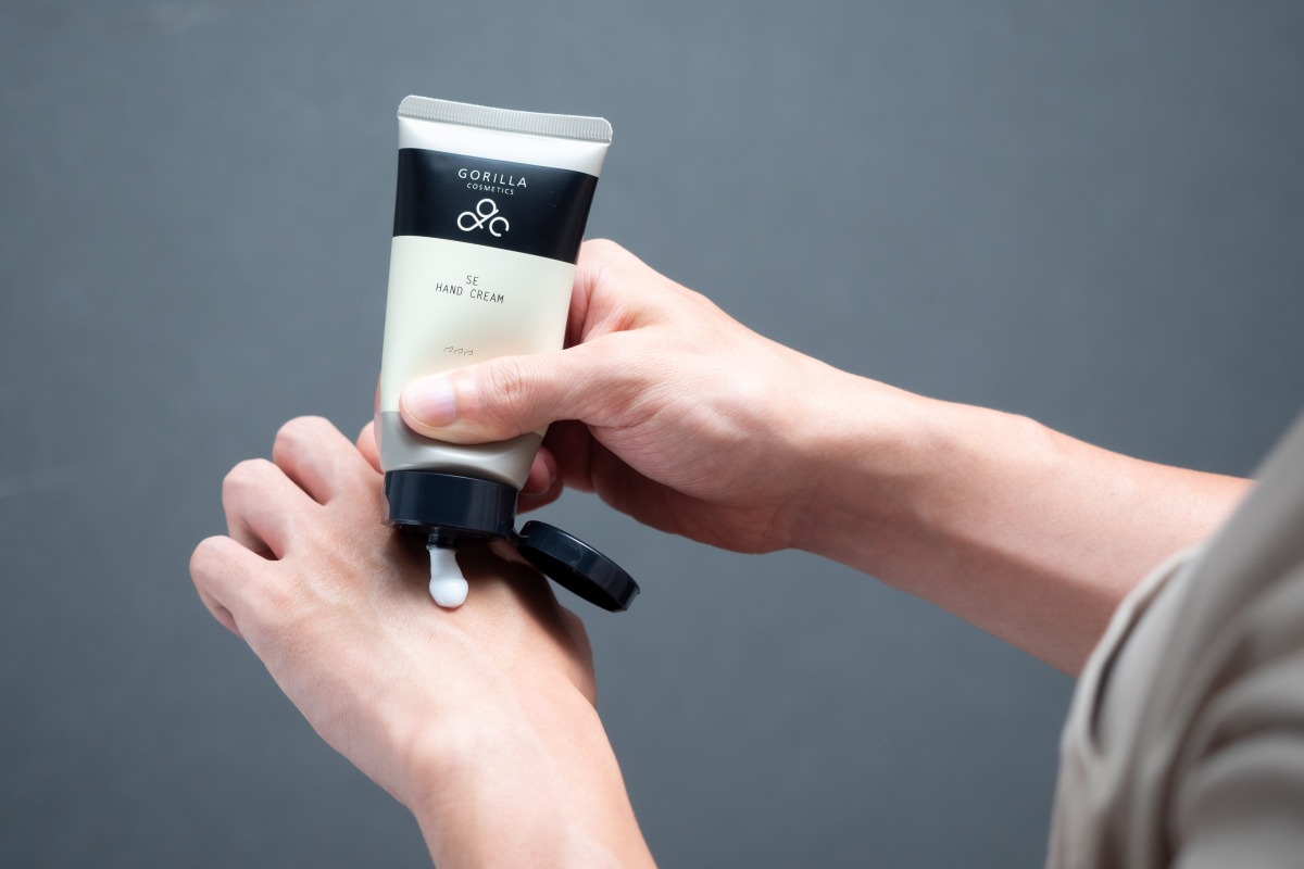 1.乾燥が気になる時に、手の甲に1.5cm程度を出し、手の甲同士をすり合わせてクリームを伸ばす。